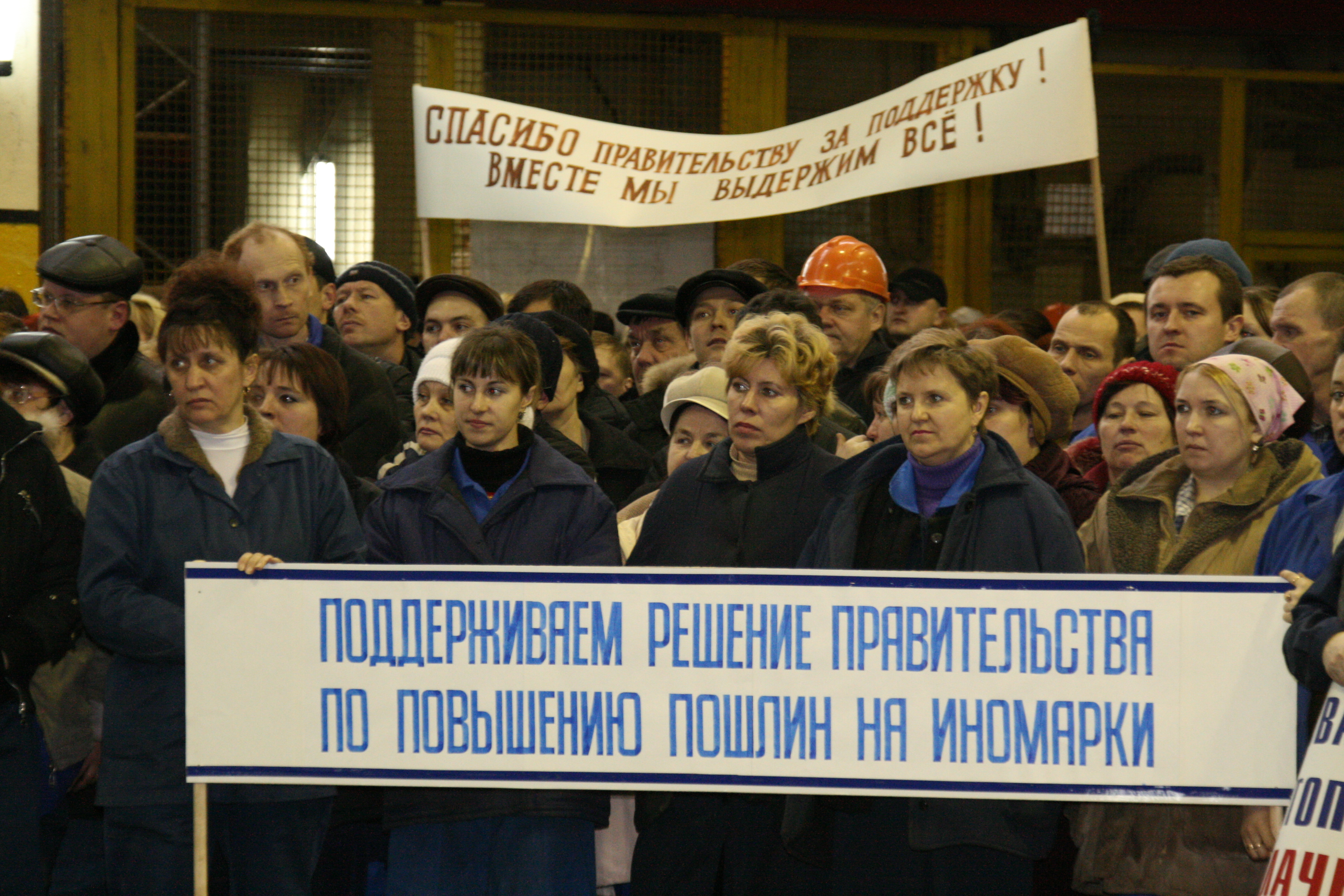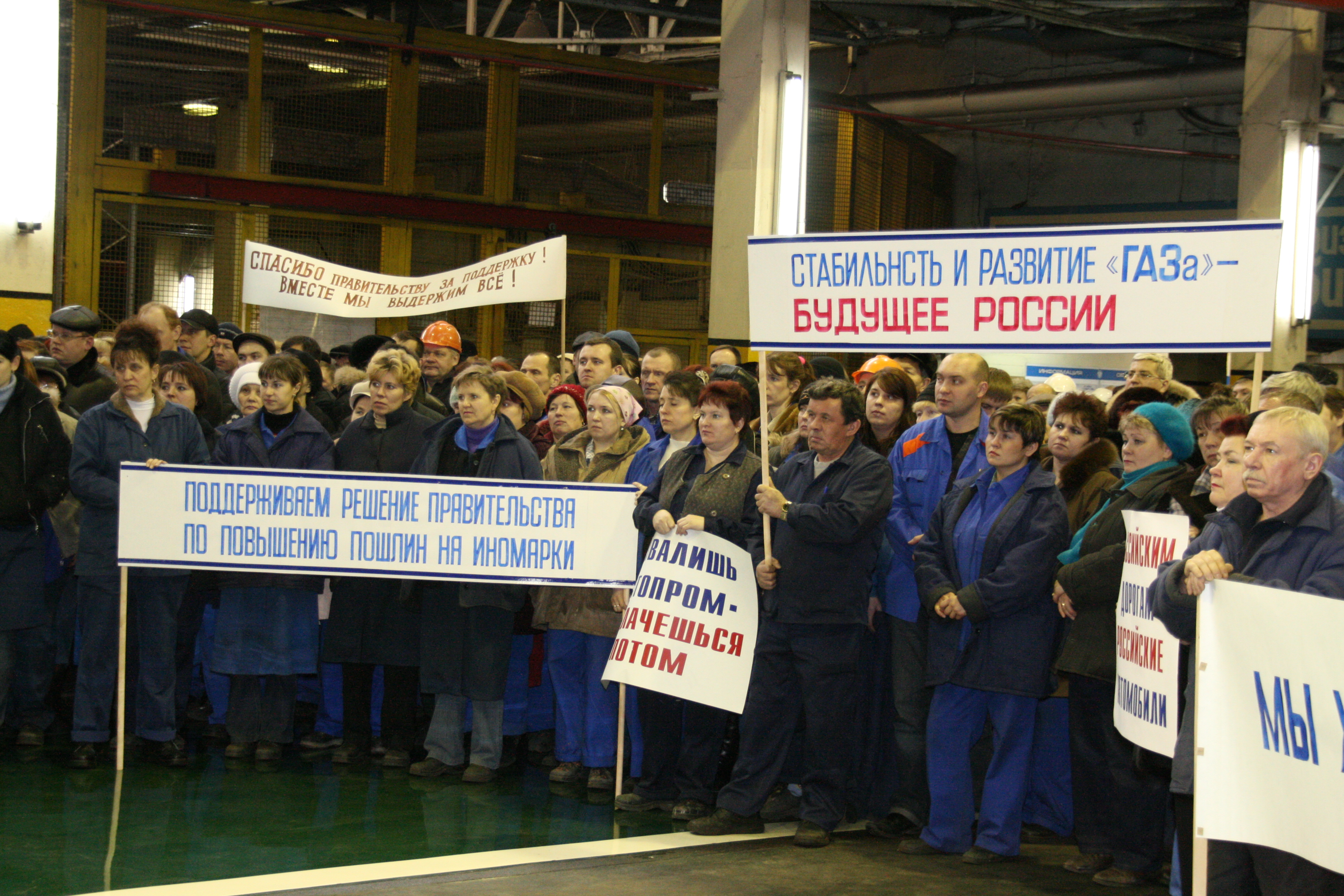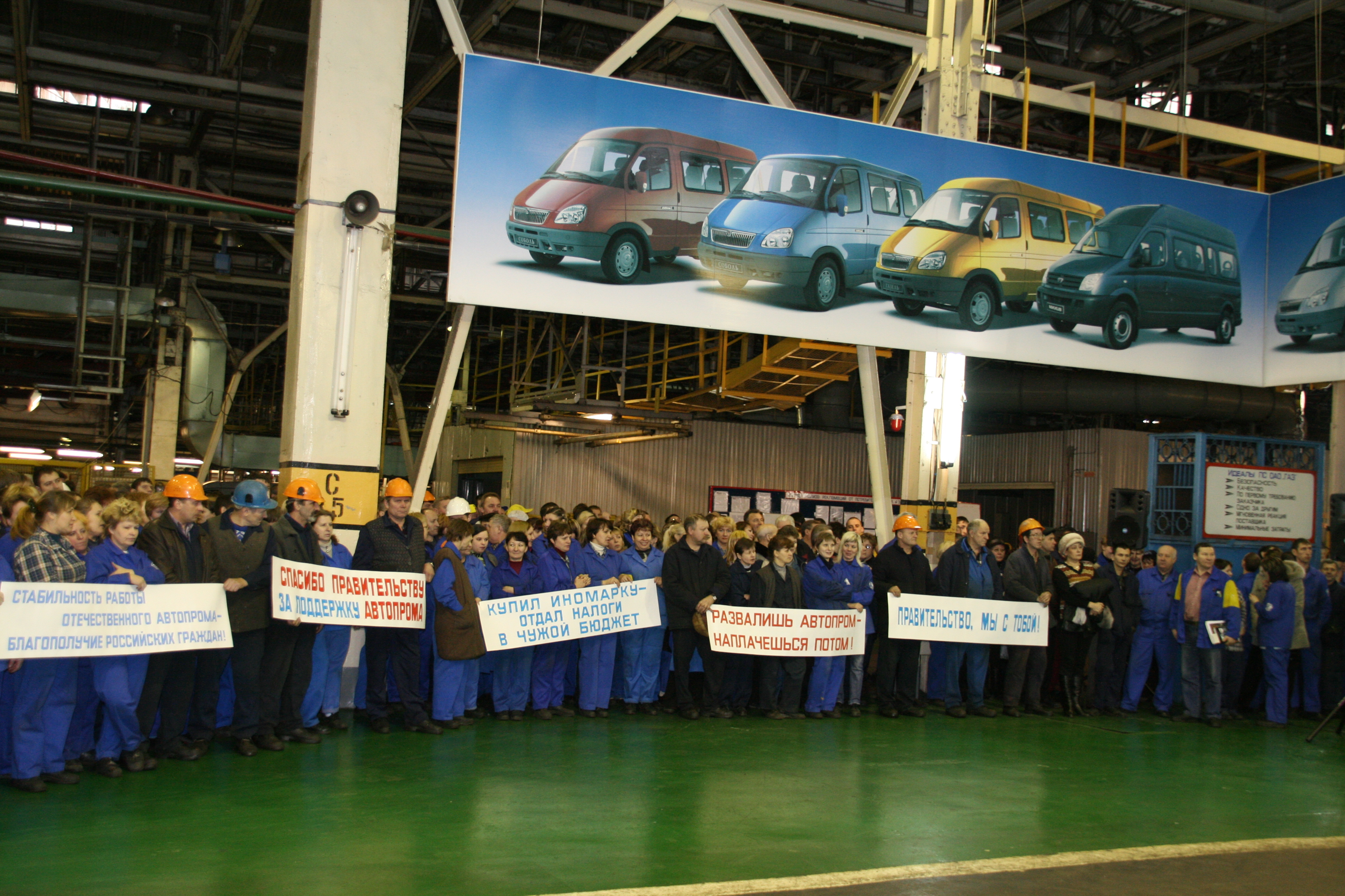 Трудовой коллектив Горьковского автомобильного завода одобряет принятый Правительством РФ план мероприятий по поддержке отечественной автомобильной промышленности, увеличению таможенных пошлин на ввозимые в страну иномарки и другие меры, способствующие сохранению сотен тысяч рабочих мест в автопроме, развитию отрасли нашей страны, а не иностранных держав.