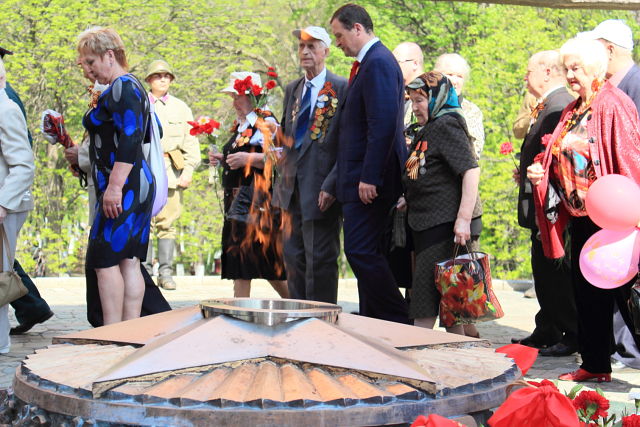 У Вечного огня прошел торжественный митинг, собравшиеся почтили память погибших в годы войны минутой молчания, запустили в небо белых бумажных журавлей, прикрепленных к воздушным шарам, прогремели оружейные залпы и праздничный фейерверк, запущены в небо белые голуби.