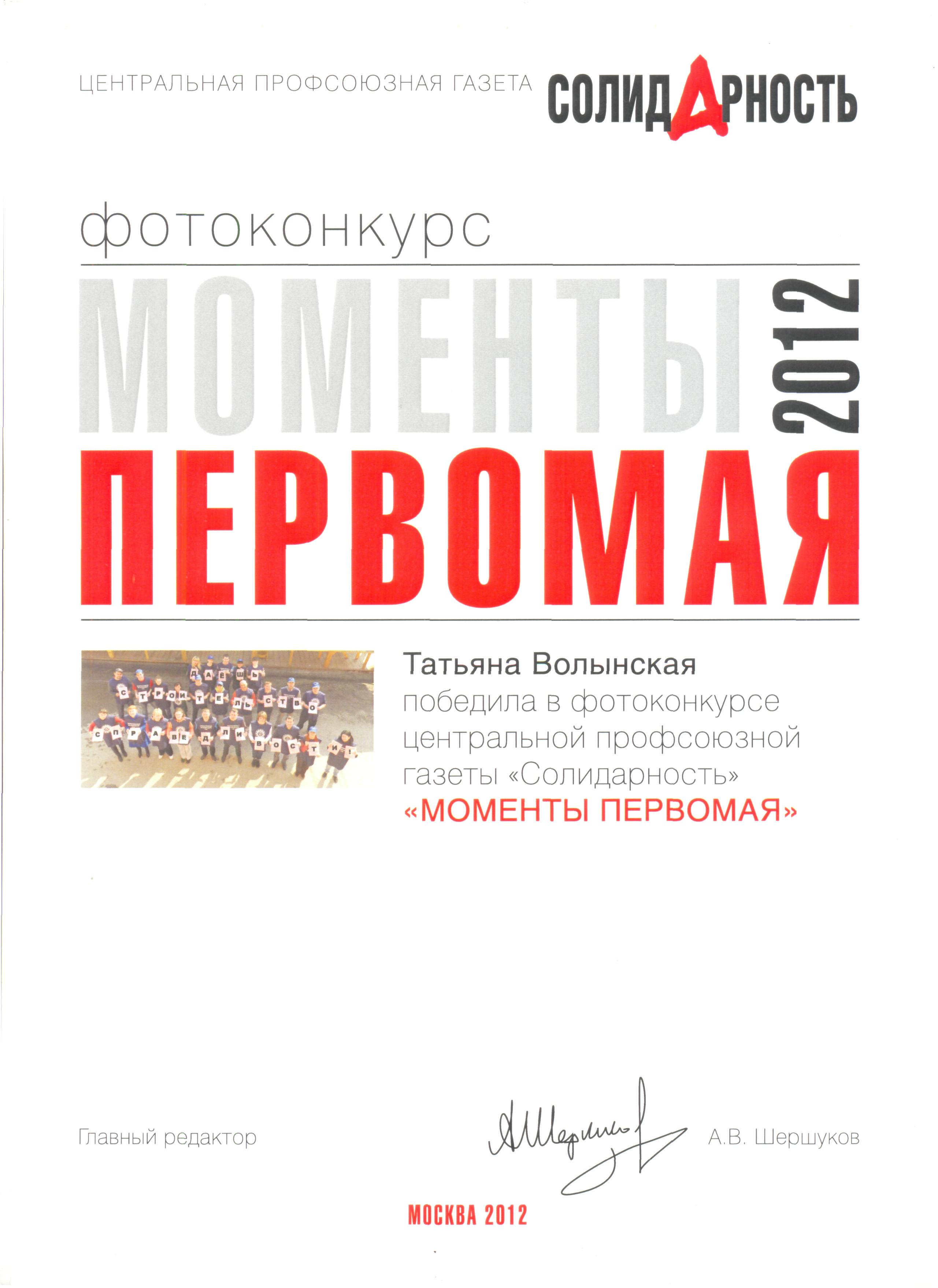 На конкурс лозунгов «Моменты Первомая – 2012» было прислано 70 фоторабот и 6 видеозаписей от профсоюзных активистов – организаторов и участников первомайских демонстраций из Москвы, Покровки, Сарапула, Тольятти, Усть-Илимска, Орска, Красноярска и других населённых пунктов России.