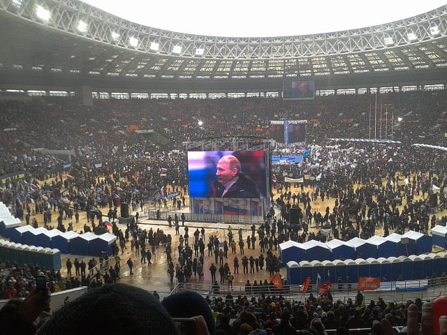 Он говорит не долго, но, сколько ни пытайся найти в его словах ''воду'' - не получится. Впрочем, Путин – не робот. В конце своей речи он вдруг произносит: - Я хочу вас всех поблагодарить за поддержку - и тех, кто находится на стадионе в Лужниках, и тех, кто за его стенами, и всех, кто поддерживает нас в каждом уголке нашей огромной великой Родины. Я не могу обнять каждого из вас и каждому из вас пожать руку, но я благодарю вас и за поддержку, и за моральную помощь… Совершенно по-человечески. Отрепетировать такое невозможно.