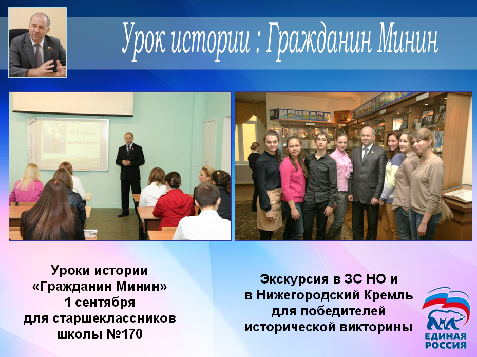 Проведены традиционный акции «Школьные рюкзачки для будущих первоклассников», «Урок истории. Гражданин Минин» для старшеклассников 1 сентября, «Депутатская елка» для малообеспеченных и многодетных семей, собраны книги для областного социально-реабилитационного центра для несовершеннолетних «Бригантина», а также теплые вещи для центра временного содержания несовершеннолетних преступников.