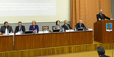 В зале мэрии автограда около 90% собравшихся составляли женщины, что весьма красноречиво говорило о том, что у профсоюза сегодня женское лицо и мужчина с активной жизненной позицией, готовый отстаивать интересы трудящихся — большая редкость. Но перед встречей с профактивом Челнов у Михаила Шмакова было рандеву с мэром города Василем Шайхразиевым, а Гумер Нуретдинов — профсоюзный лидер КАМАЗа и председатель городского отделения ФНПР — организовал экскурсию по КАМАЗу и встречи с руководством завода и лидерами первичных профсоюзных организаций автогиганта. Шмаков заявил, что приехал услышать мнение о важнейшем для профсоюзов страны генеральном тарифном соглашении, работа над которым сейчас идет в организации. Ведь профсоюз КАМАЗа — одна из крупнейших первичных организаций в системе ФНПР. Кстати, со Шмаковым в Челны приехала Татьяна Водопьянова — руководитель республиканского объединения профсоюзов, также профсоюзные лидеры АвтоВАЗа и ГАЗа — Сергей Зайцев и Сергей Солодов. а также Андрей Фефелов — председатель Ассоциации машиностроительных профсоюзов России, председатель Профсоюза работников АСМ РФ.
