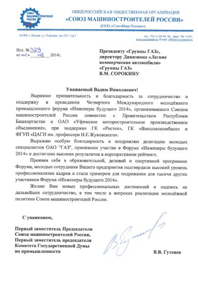 Наши коллеги достойно проявили себя в рамках образовательного курса и принимали активное участие в культурно-массовых программах, и достойно представили «Группу Газ» в рамках форума. Это подтверждает и благодарственное письмо Президенту «Группы ГАЗ» Сорокину Владимиру Николаевичу от Первого заместителя Председателя Союза машиностроителей России, Первого заместителя председателя Комитета Государственной Думы по промышленности Гутенёва Владимира Владимировича, в котором он отметил, что ребята «подтвердили высокий уровень профессионализма кадров и стали примером для подражания для тысячи других участников Форума «Инженеры будущего 2014».