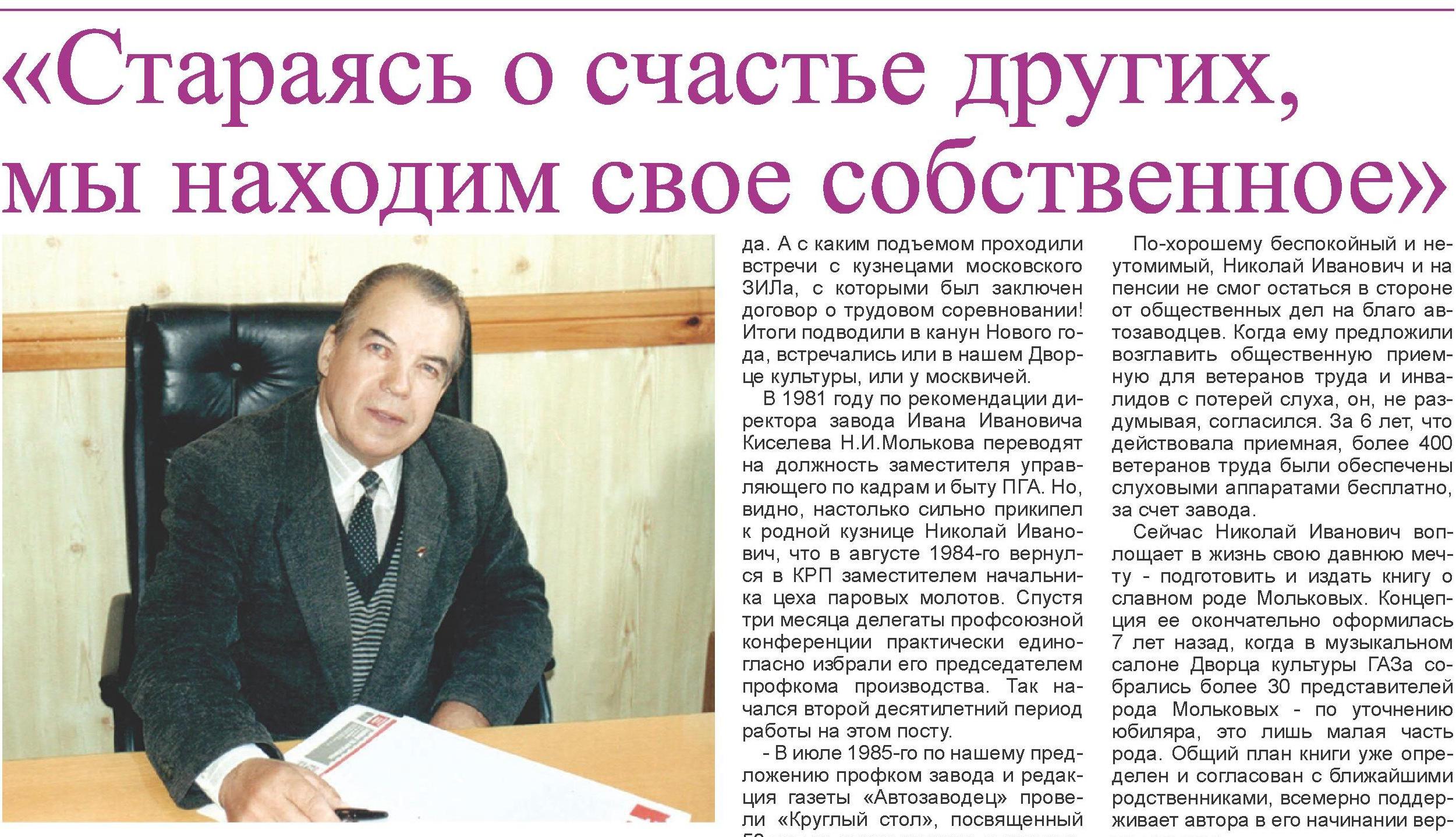 28 декабря 2011 г. наш «Автозаводец» опубликовал рассказ-интервью Н.А. Кулигина, бывшего управляющего кузнечно-рессорным производством. Николай Алексеевич тоже проработал в нашей, родной нам, кузнице более 40 лет. Он знает меня очень хорошо как человека, и как общественного руководителя. Мне хотелось бы дословно привести его оценку, опубликованную в «Автозаводце»: «Не могу не сказать и о наших общественниках. Долгие годы председателем профкома нашего производства работал Н.И. Мольков. Считаю, что у него был особый дар – умение работать с людьми. Как вспомню про организацию какого-либо вида соревнований среди бригад участков и цехов, так сразу Николай Иванович на ум приходит. Он ведь никому покоя не давал, и я ему за это очень благодарен». А сегодня я хочу поблагодарить Николая Алексеевича за добрую память и оценку моей работы. Именно Николай Алексеевич первым сказал мне в начале 1984 г., когда я работал начальником цеха переработки производственных отходов (ЦППО) нашего завода: «Николай Иванович, приходите, не откладывая, к нам, в свой родной коллектив. Мы Вас все очень ждем».