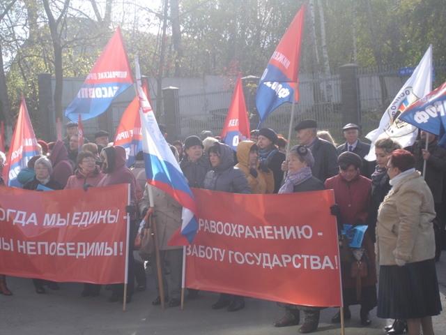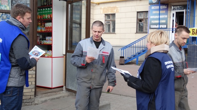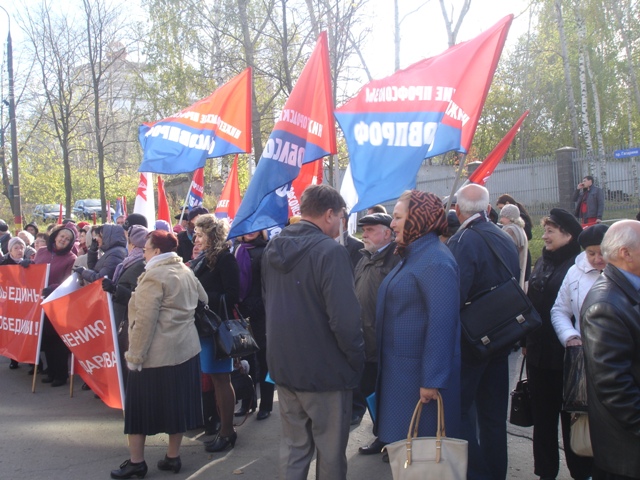 Участники пикета выдавали листовки, а также информировали о Всемирном дне действий профсоюзов и о выдвигаемых профсоюзами требованиях "За достойный труд", "За достойные пенсии", "Против бедности и социального неравенства".