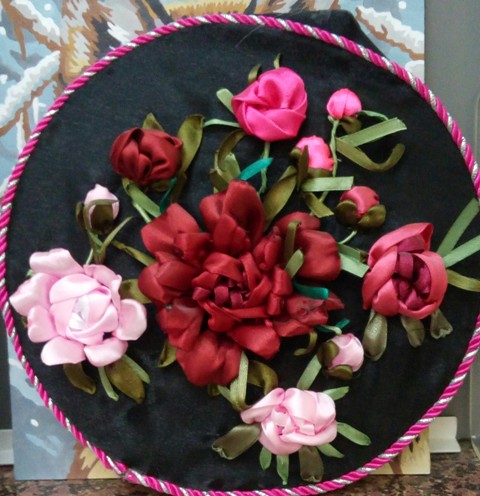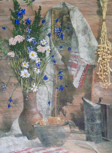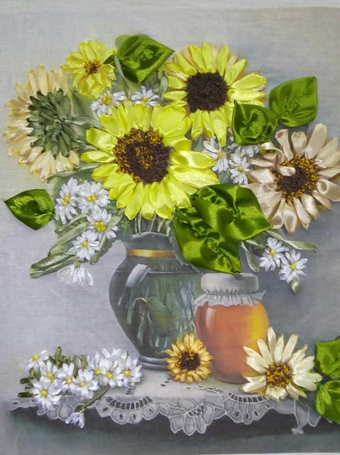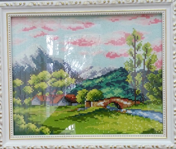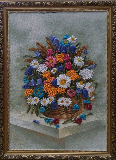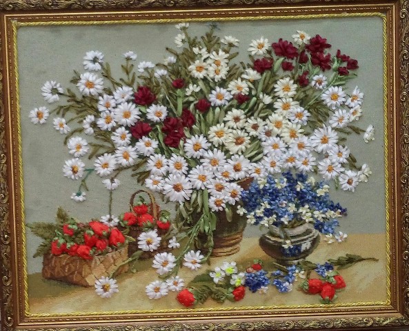 Были предоставлены следующие работы: картины, нарисованные красками, картина, выложенная пайетками, работы, исполненные в разных стилях: шелковыми лентами, стразами и бисером.