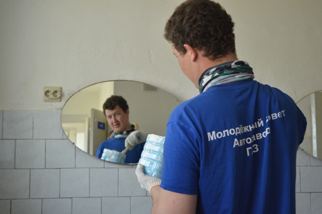 Часть активистов трудового десанта занималась покраской окон в умывальных комнатах и покраской дверей корпуса «Садко».