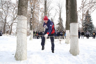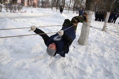 На морозе в каске, в бронежилете, с автоматом в руках было необходимо преодолеть «гать» (болото), затем поочерёдно проползти через заграждение, пробежать по бревну, из положения лёжа метнуть гранату в «Танк», выстрелить три раза из винтовки по мишеням и вернуться обратно на исходную позицию, передав каску, бронежилет и автомат другому члену команды.