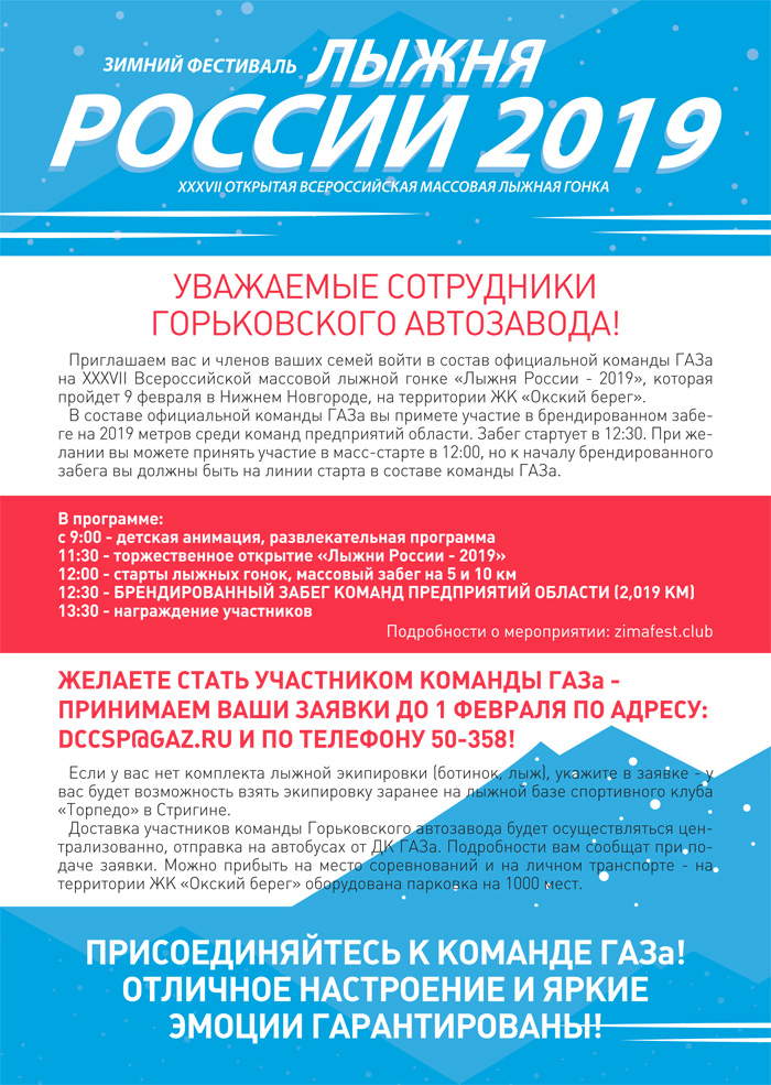 Приглашаем вас и членов ваших семей войти в состав официальной команды ГАЗа на XXXVII Всероссийской массовой лыжной гонке «Лыжня России – 2019», которая пройдет 9 февраля в Нижнем Новгороде на территории ЖК «Окский берег».