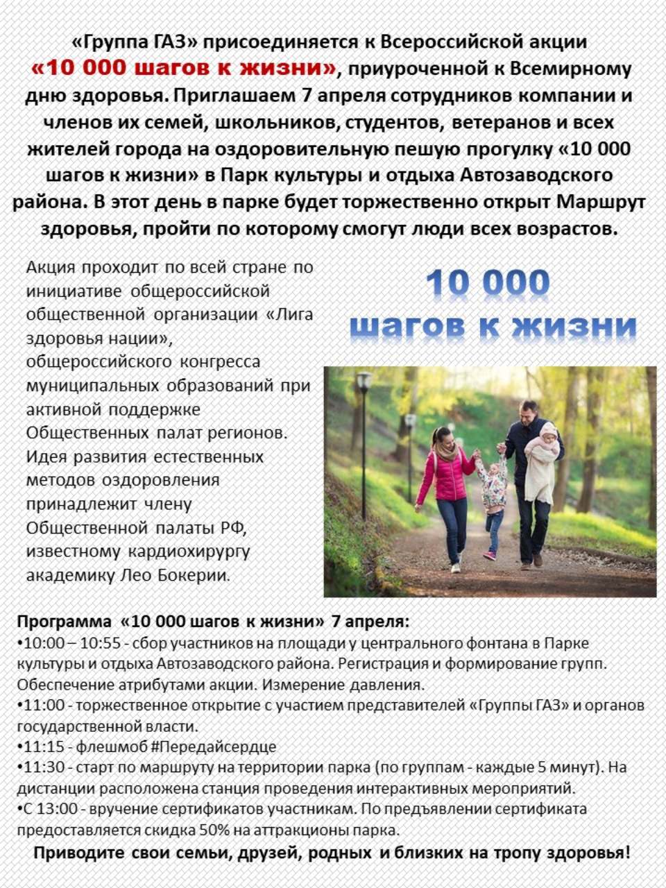 Маршрут «10 000 шагов к жизни» основан на рекомендации Всемирной организации здравоохранения - проходить в день от 6 до 10 тысяч шагов. Такая двигательная нагрузка позволяет поддерживать нормальную физическую активность. В «Группе ГАЗ» организована большая работа по сохранению здоровья работников, проводится много спортивных мероприятий, к которым присоединяется все больше жителей регионов. В поддержке Всероссийской акции «10 000 шагов» и приобщении людей к здоровому образу жизни компания видит свою социальную миссию.