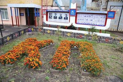 Когда комиссия подошла ко входу в СКП, ее взору предстала огромная клумба «ЦССЦМК» (цех сварки и сборки цельнометаллических кузовов). Причем клумба расположилась в том месте, где раньше был асфальт с его унылым грязно-серым видом, постоянной запыленностью. Со слов начальника цеха Киселева В.И., который принимал личное участие в презентации работы, в настоящее время клумба не только способствует позитивному настрою работников цеха, но и несет в себе имиджевую функцию.