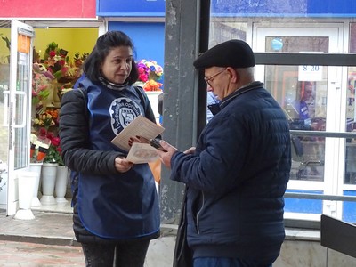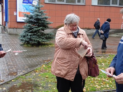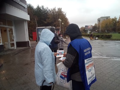 Участники пикета выдавали листовки, а также информировали о Всемирном дне действий профсоюзов и о выдвигаемых профсоюзами требованиях "За достойный труд", "За достойные пенсии", "Против бедности и социального неравенства".