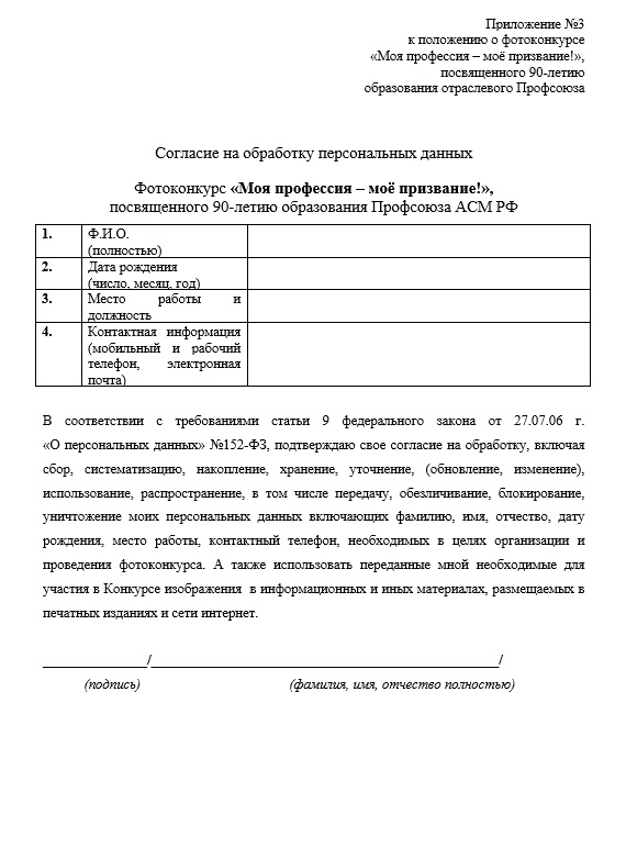 4.2.7. Участник Конкурса дает согласие на обработку персональных данных (Приложение 3).