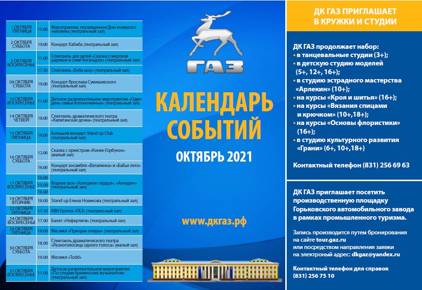 Предлагаем Вашему вниманию афишу мероприятий Дворца культуры ОАО "ГАЗ" на октябрь 2021 года.