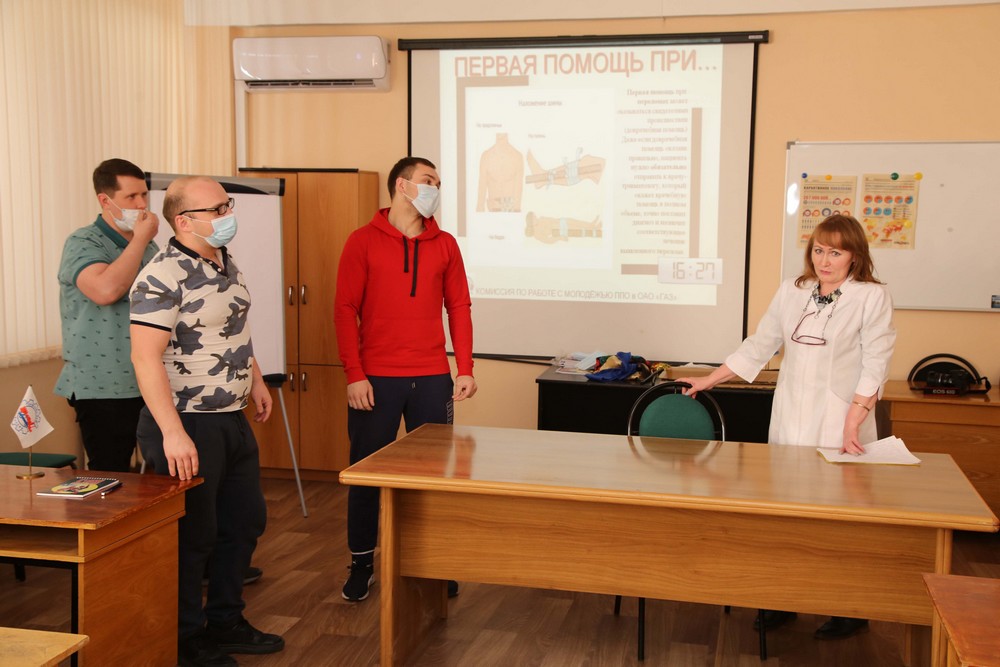 Ольга Аркадьевна Николаева – старшая медицинская сестра МСЧ ГАЗ рассказала, показала и даже дала попробовать оказать первую помощь при переломе бедра. Ребята сами попробовали наложить шину из подручных средств и по итогам разобрали, правильно ли они это сделали.