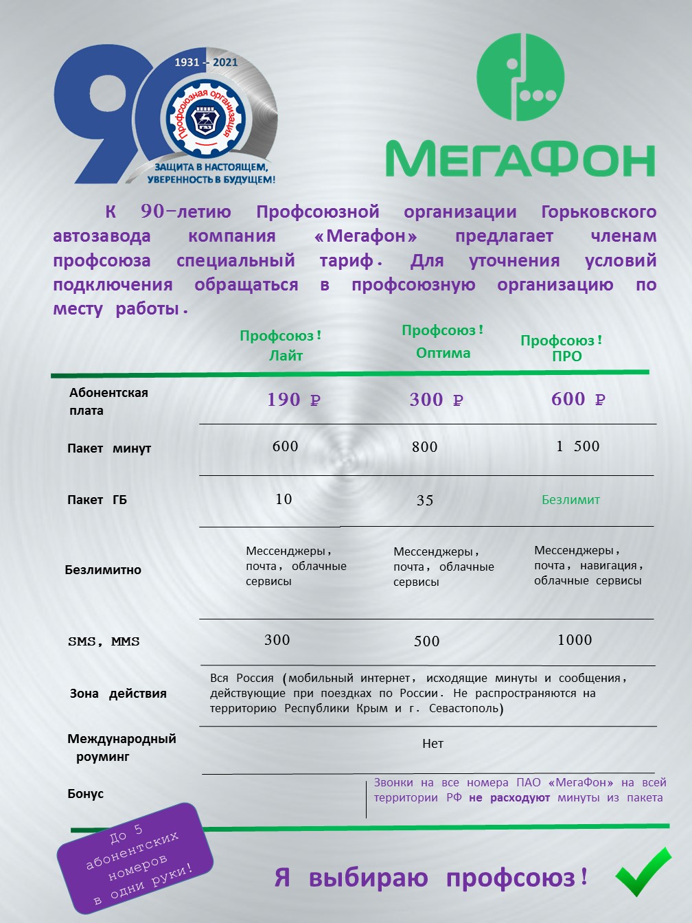 К 90-летию ППО в ОАО «ГАЗ» компания Мегафон разработала для членов профсоюза спецтарифы, к которым могут подключаться как действующие, так и новые клиенты оператора сотовой связи.