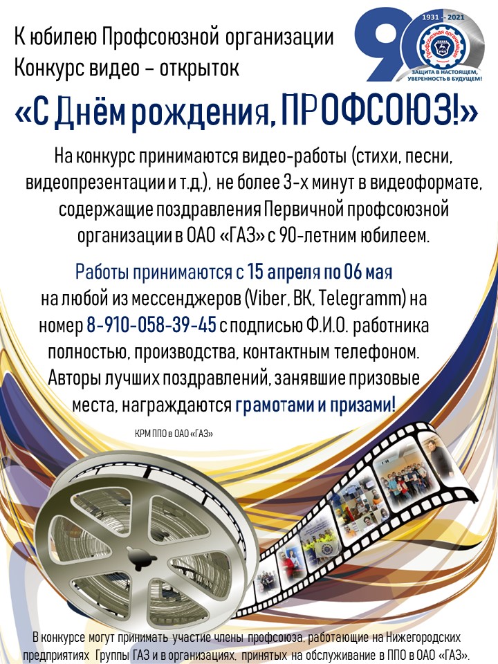 7 апреля 2021 года к 90-летию Профсоюзной организации объявляется конкурс видеооткрыток.