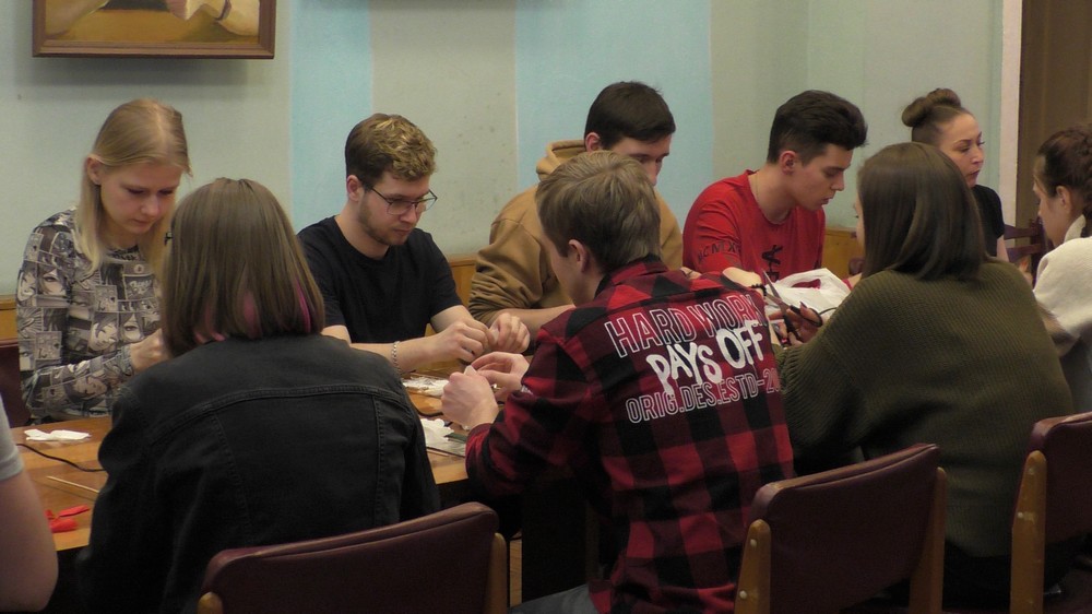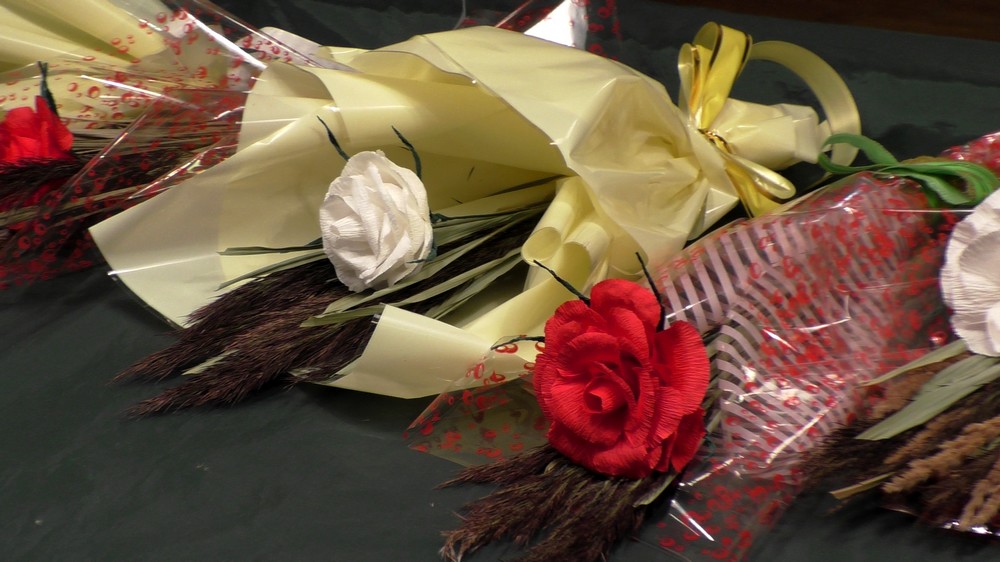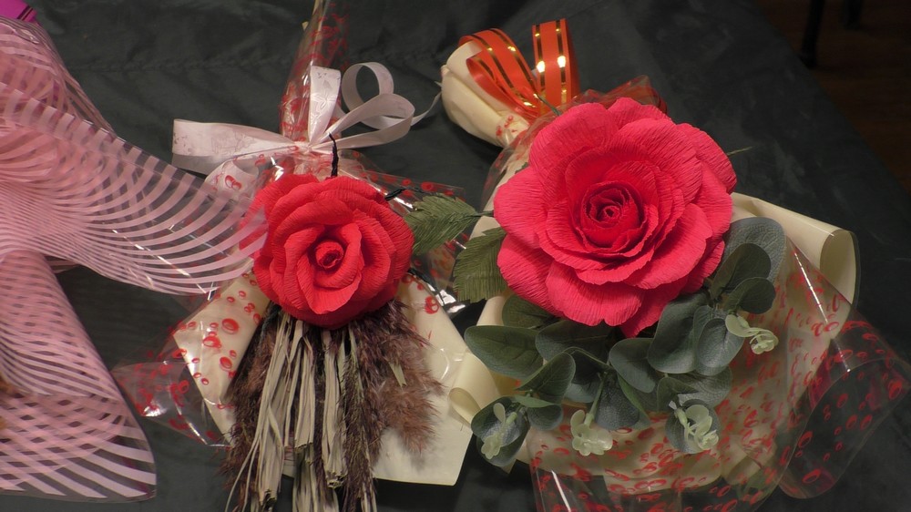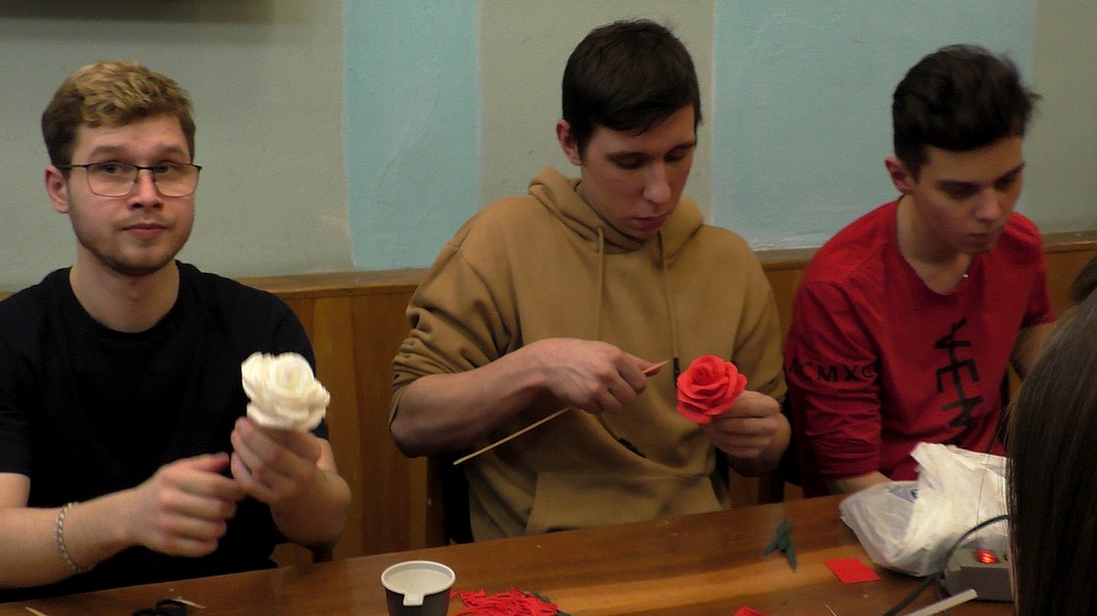 Полтора часа в дружественной и непринужденной обстановке пролетели незаметно. И вот у каждого участника «распустилась» в руках роза! А когда к цветку добавилась ещё и упаковка, получился оригинальный букет. Все ребята очень старались, чтобы их цветок был самым лучшим. Кто-то делал цветок в подарок маме, кто-то девушке или супруге, и даже на День рождения сестрёнке.