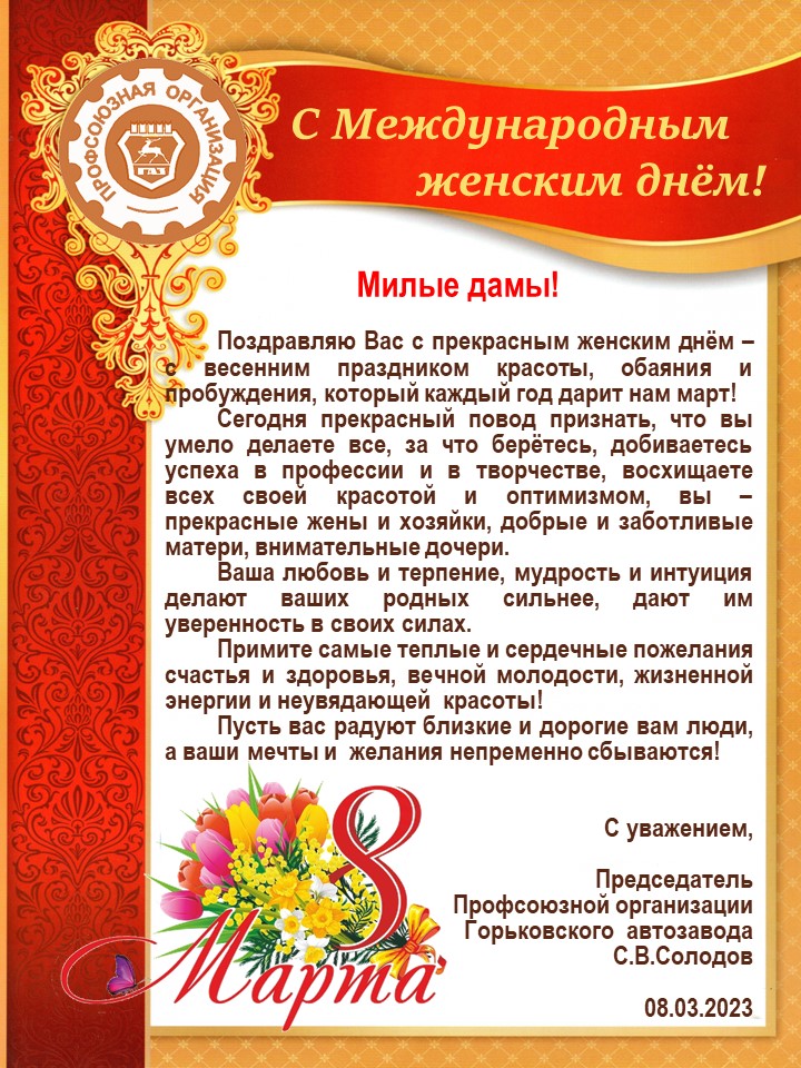 В этот прекрасный весенний день Профсоюз работников автомобильного и сельскохозяйственного машиностроения Российской Федерации поздравляет Вас с замечательным праздником Международным женским днем 8 Марта!