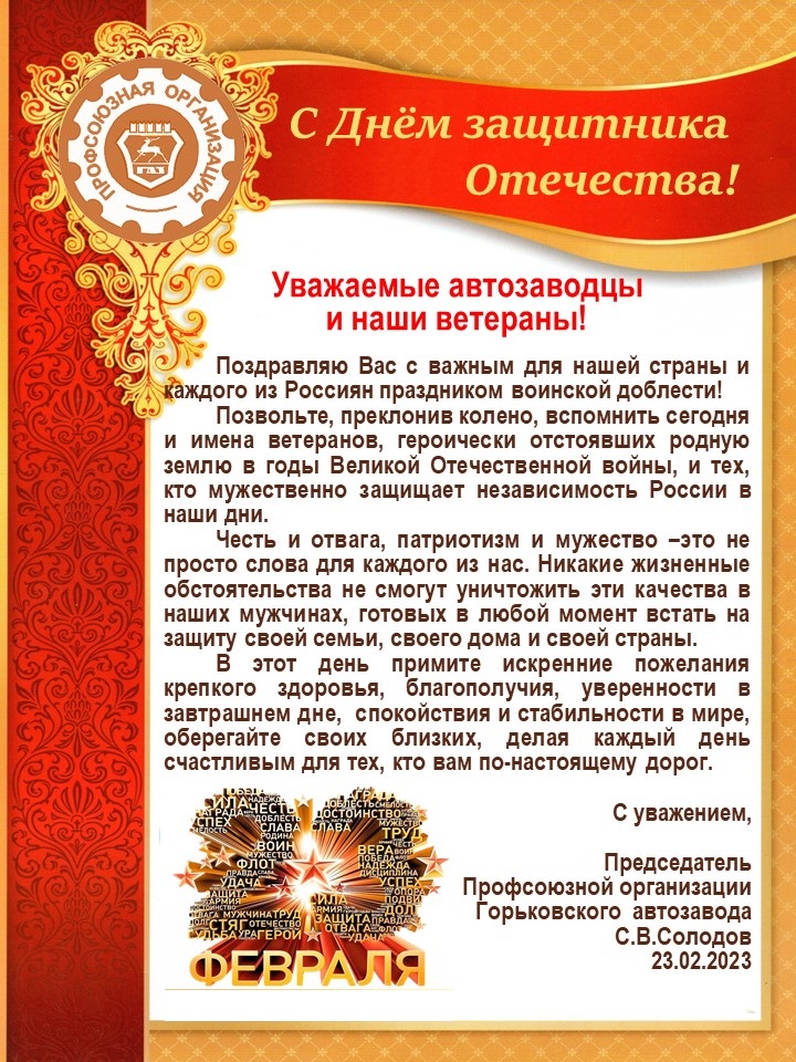 От имени Центрального комитета Профсоюза работников автомобильного и сельскохозяйственного машиностроения Российской Федерации сердечно поздравляю вас с Днём Защитника Отечества!