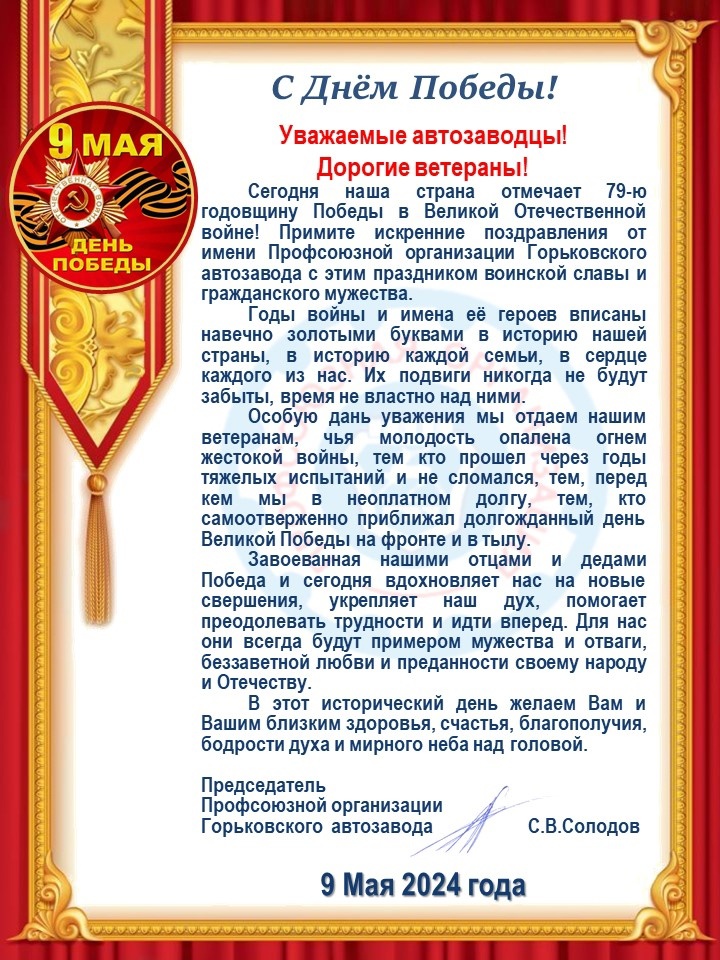 Сегодня наша страна отмечает 79-ю годовщину Победы в Великой Отечественной войне! Примите искренние поздравления от имени Профсоюзной организации Горьковского автозавода с этим праздником воинской славы и гражданского мужества.