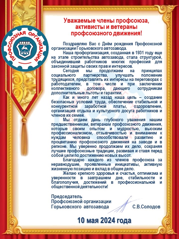 Поздравляю Вас с Днём рождения Профсоюзной организации Горьковского автозавода.