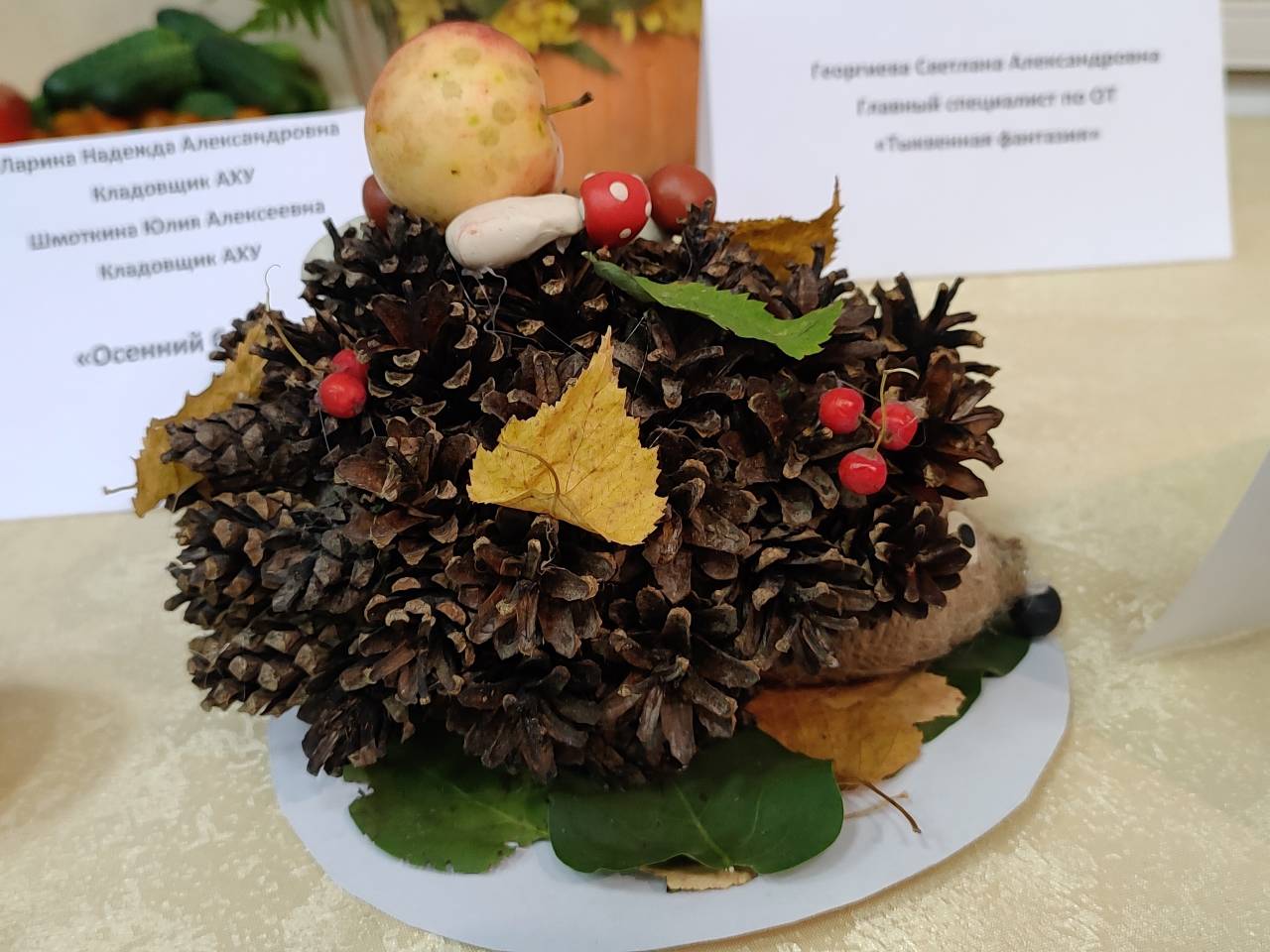 Сколько души, труда и фантазии вложили работники завода в свои творческие работы. А ёжик из шишек стал просто фаворитом выставки, заняв свое место в центре!