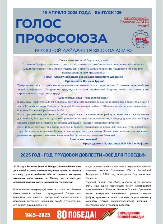 Вышел очередной номер №129 газеты Профсоюза АСМ РФ "ГОЛОС ПРОФСОЮЗА"