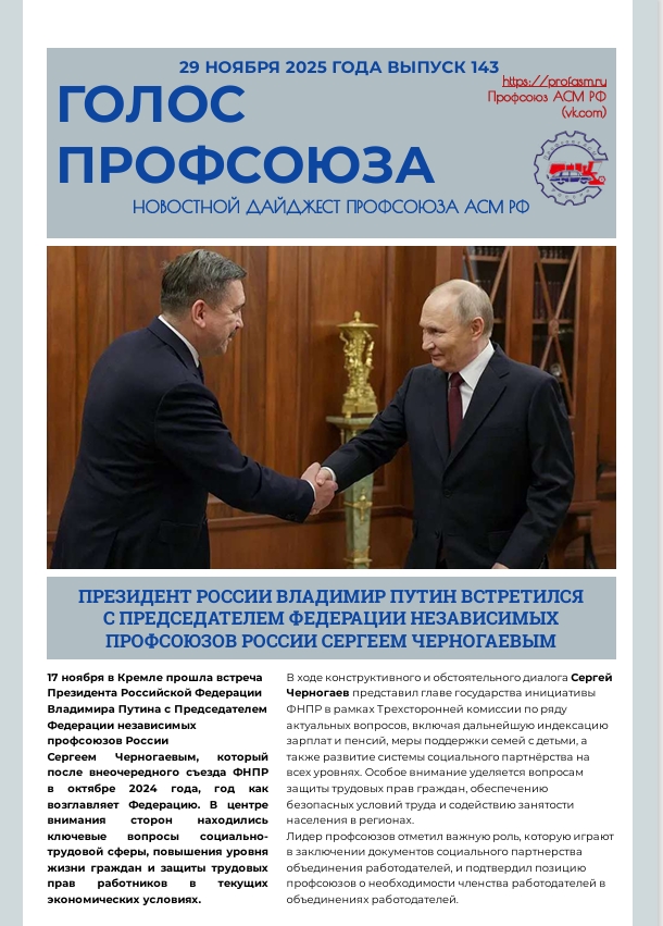 Вышел очередной номер №143 газеты Профсоюза АСМ РФ "ГОЛОС ПРОФСОЮЗА"