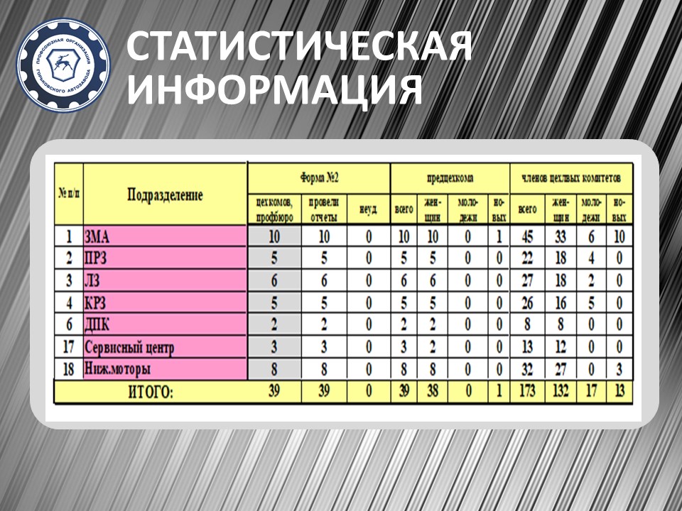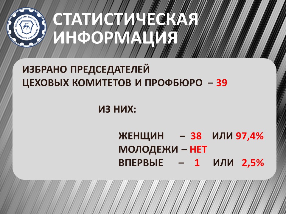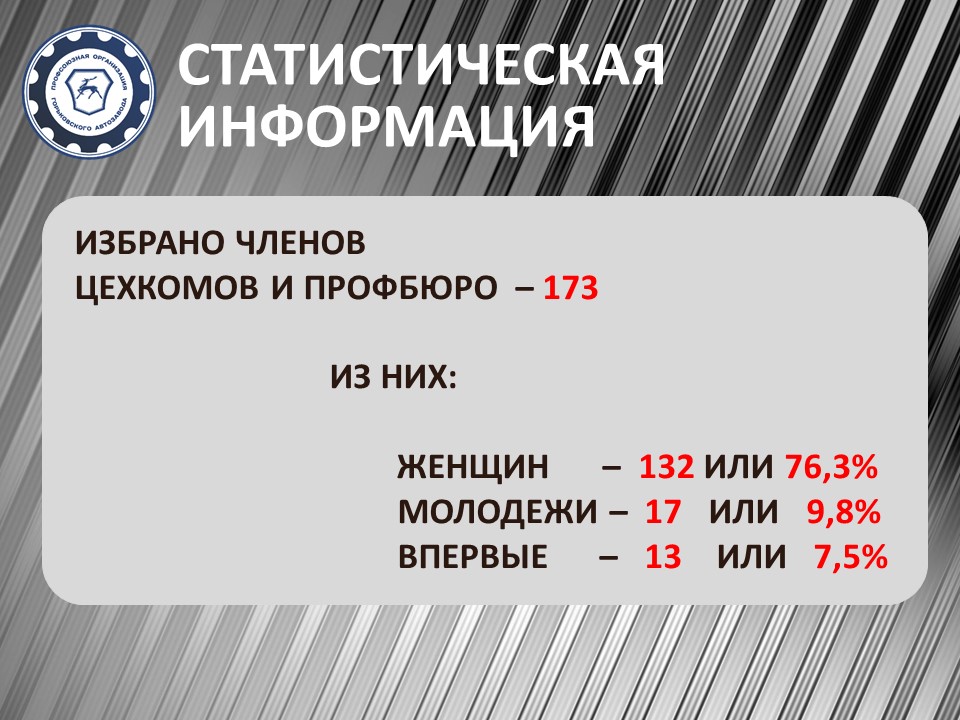 В составе цеховых комитетов и профбюро – 173 чел., из них женщин – 132 (или 76,3%), молодежи в возрасте до 35 лет – 17 (или 9,8%), впервые избраны – 13 (или 7,5%).