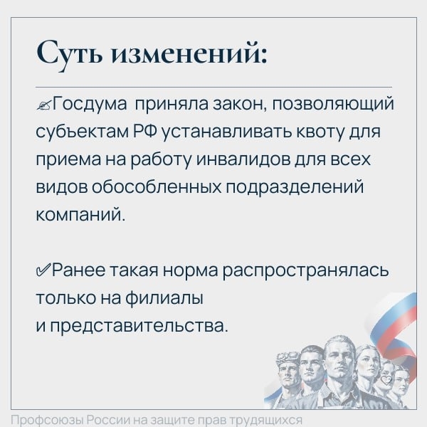 Государственная Дума РФ приняла закон, позволяющий субъектам РФ устанавливать квоту для приема на работу инвалидов для всех видов обособленных подразделений компаний.
