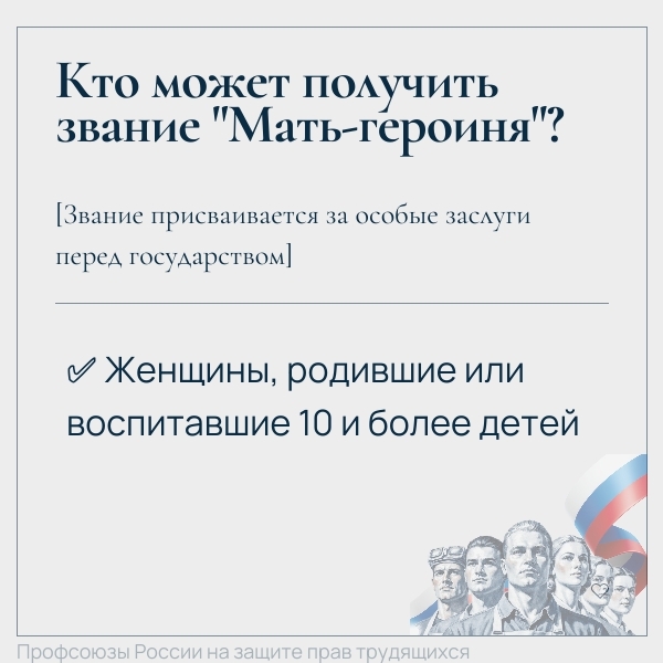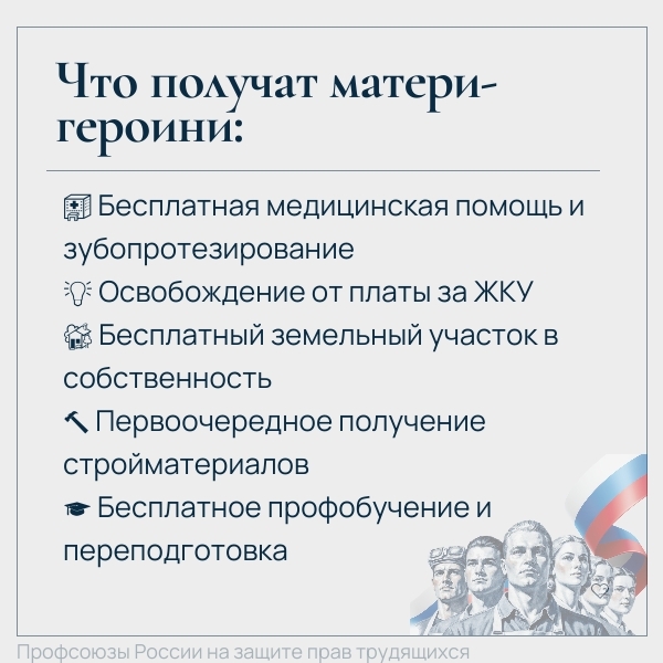 Государственная Дума РФ приняла закон, который уравнивает в социальных гарантиях Матерей-героинь и Героев труда. Инициатива направлена на поддержку женщин, воспитавших десять и более детей.