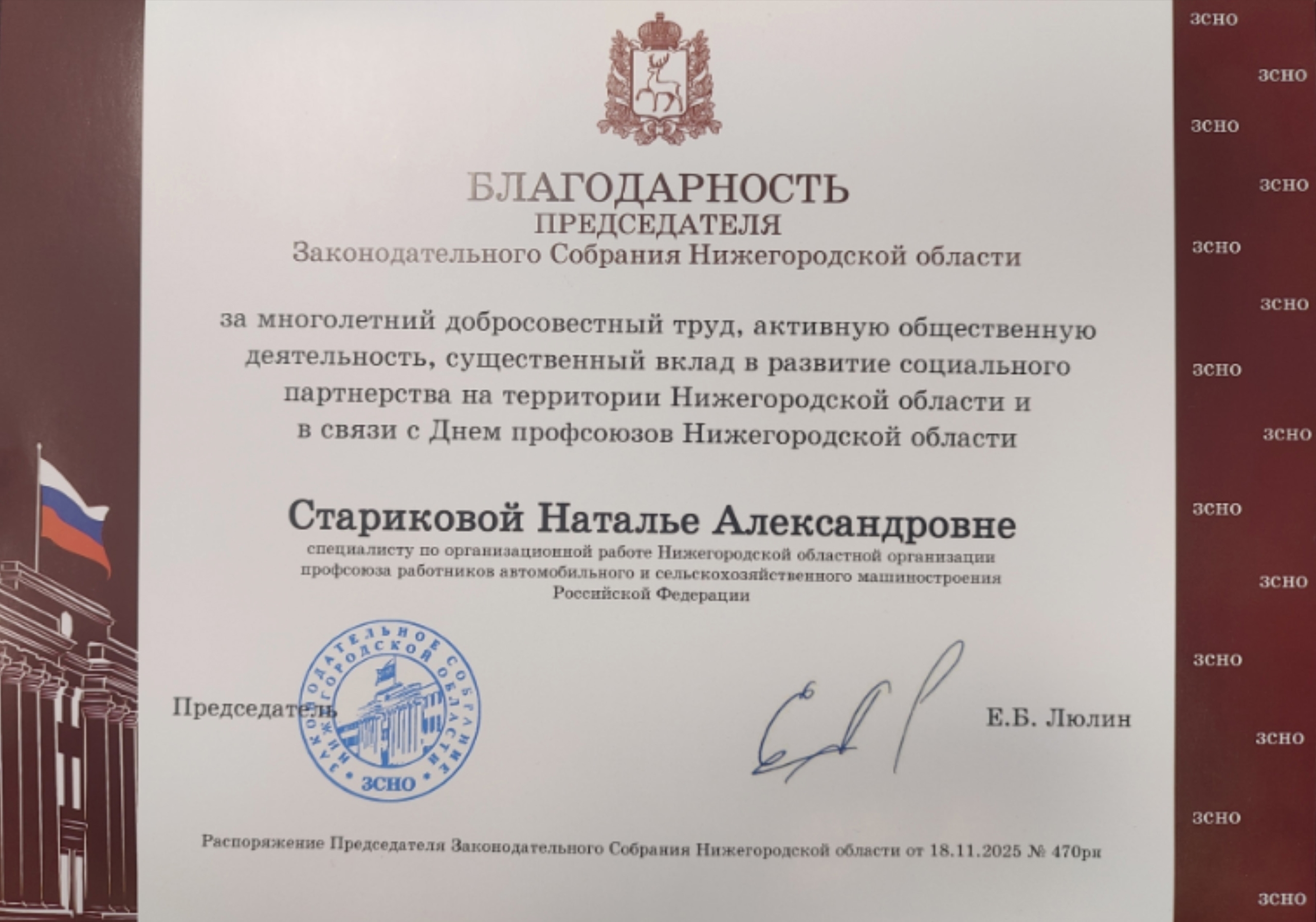 Старикова Наталья Александровна, ветеран профсоюзной организации Горьковского автозавода, специалист по организационной работе Нижегородской областной организации профсоюза работников АСМ РФ награждена Благодарностью председателя Законодательного собрания Нижегородской области за многолетний добросовестный труд, активную общественную деятельность, существенный вклад в развитие социального партнерства на территории Нижегородской области и в связи с Днем профсоюзов Нижегородской области.