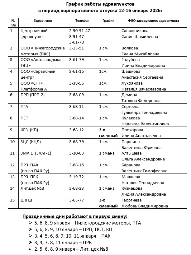 Предлагаем Вашему вниманию График работы заводских здравпунктов в период корпоративного отпуска в январе 2026г.