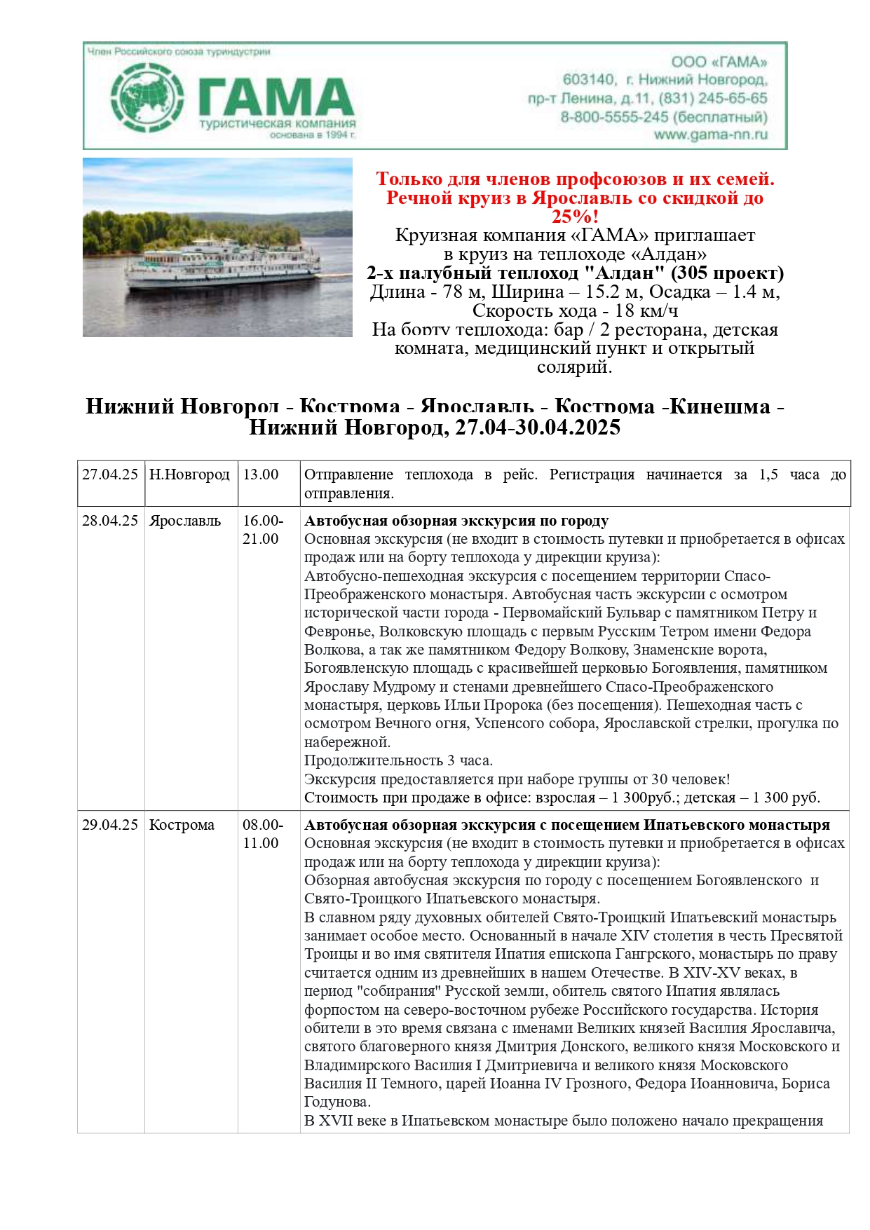 Нижегородская компания «ГАМА» - туроператор по речным круизам в Нижегородской области – предлагает членам профсоюзов и их семьям отдохнуть в речном круизе до Ярославля на теплоходе "Алдан" в апреле 2025 года со специальной скидкой до 25%.
