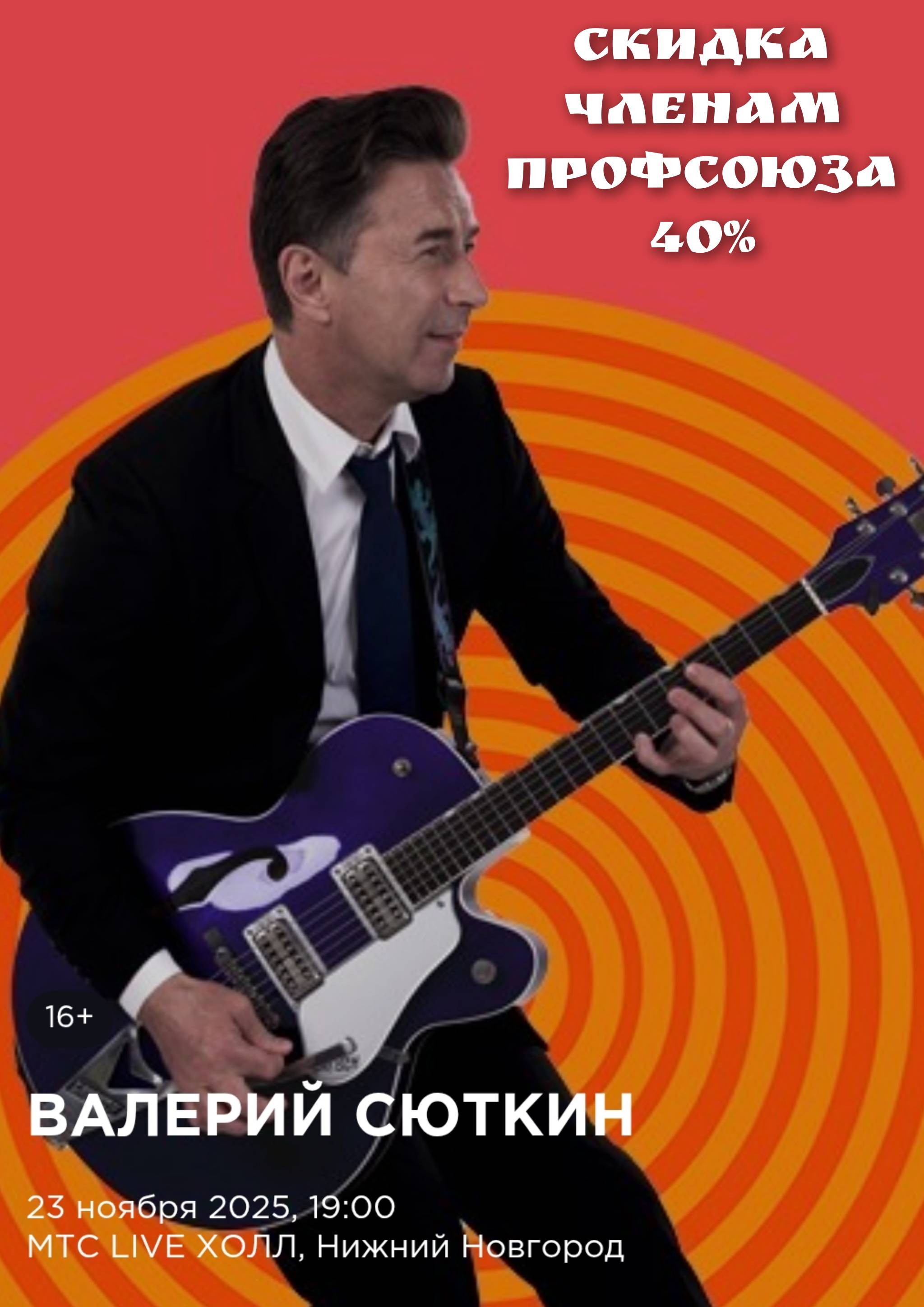 #ПрофсоюзнаяСкидка Приглашаем членов профсоюза приобрести билеты со скидкой 40% на концерт Валерия Сюткина, который состоится 23 ноября 2025г. в 19-00 час. в МТС Live Холле.