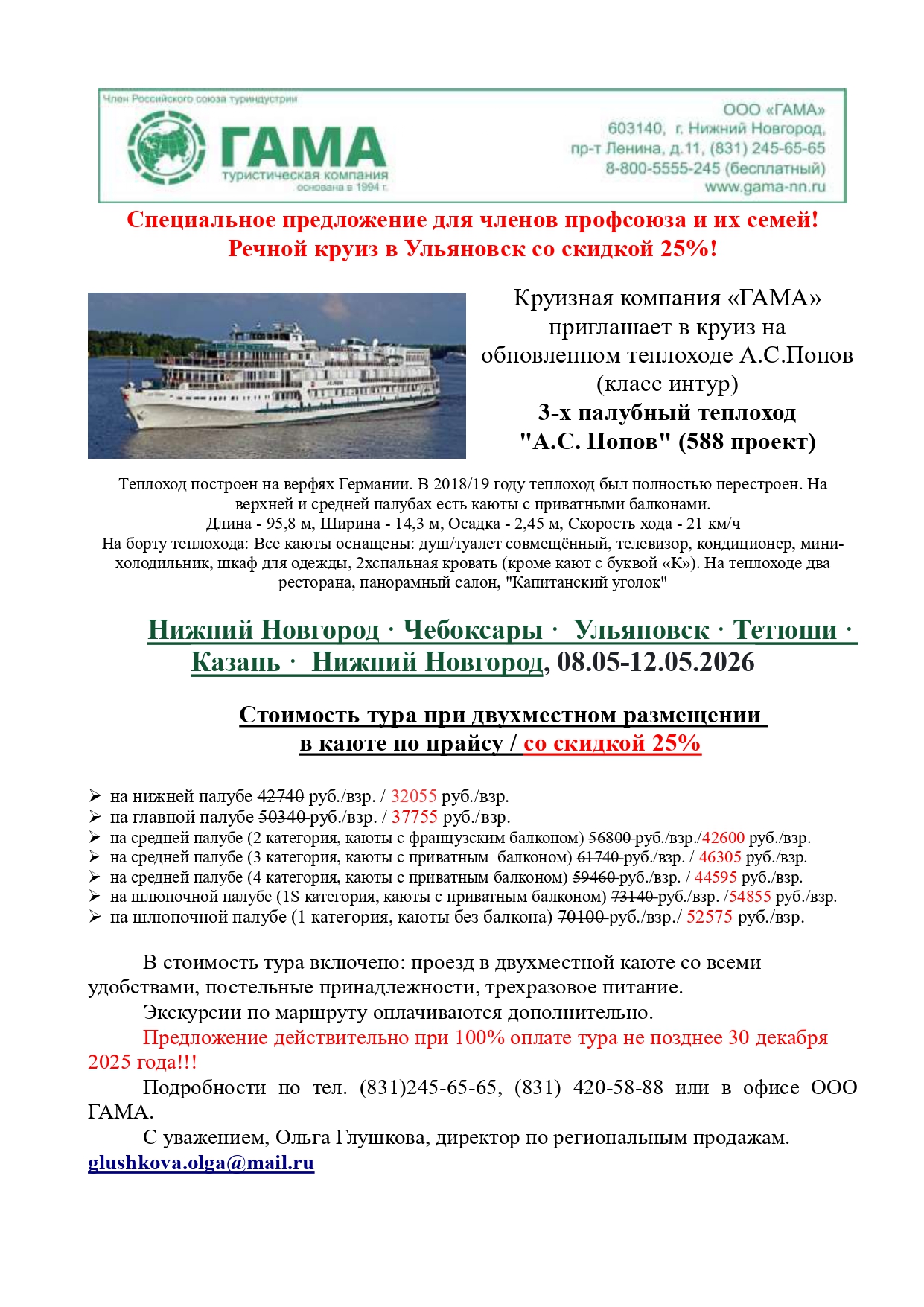 - 08.05 - 12.05.2026 по маршруту "Нижний Новгород - Чебоксары - Ульяновск - Тетюши - Казань - Нижний Новгород"
