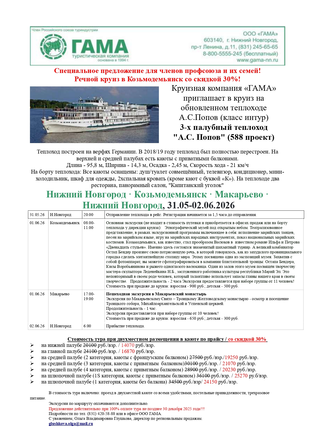 - 31.05 - 02.06.2026 по маршруту "Нижний Новгород - Козьмодемьянск - Макарьево - Нижний Новгород"