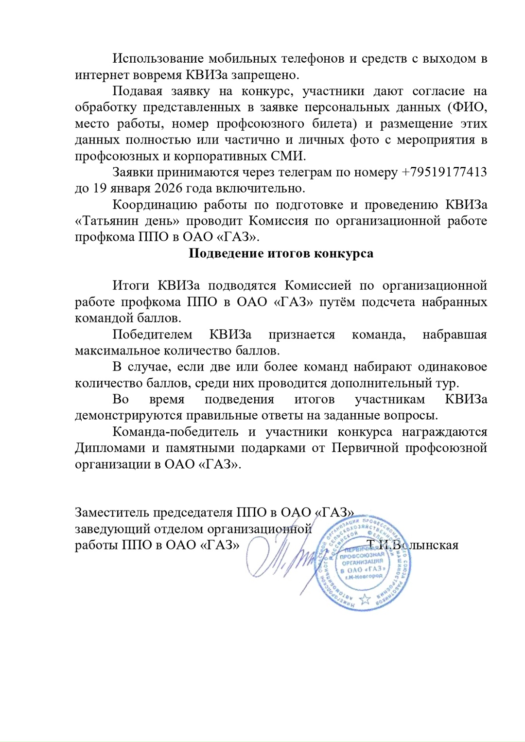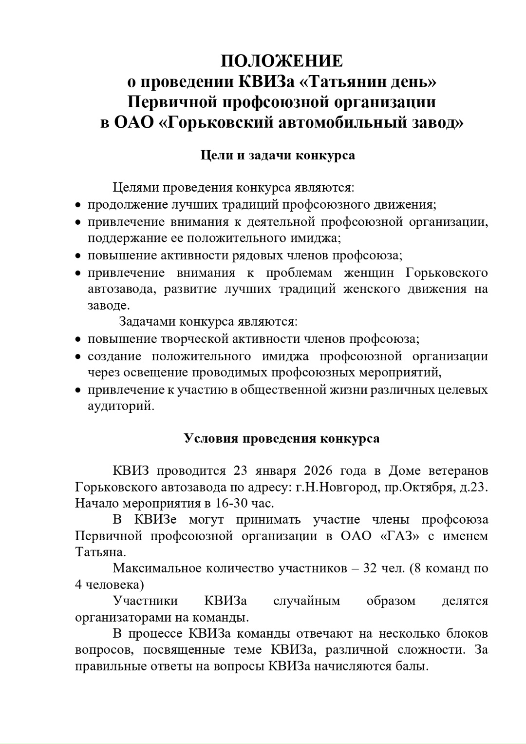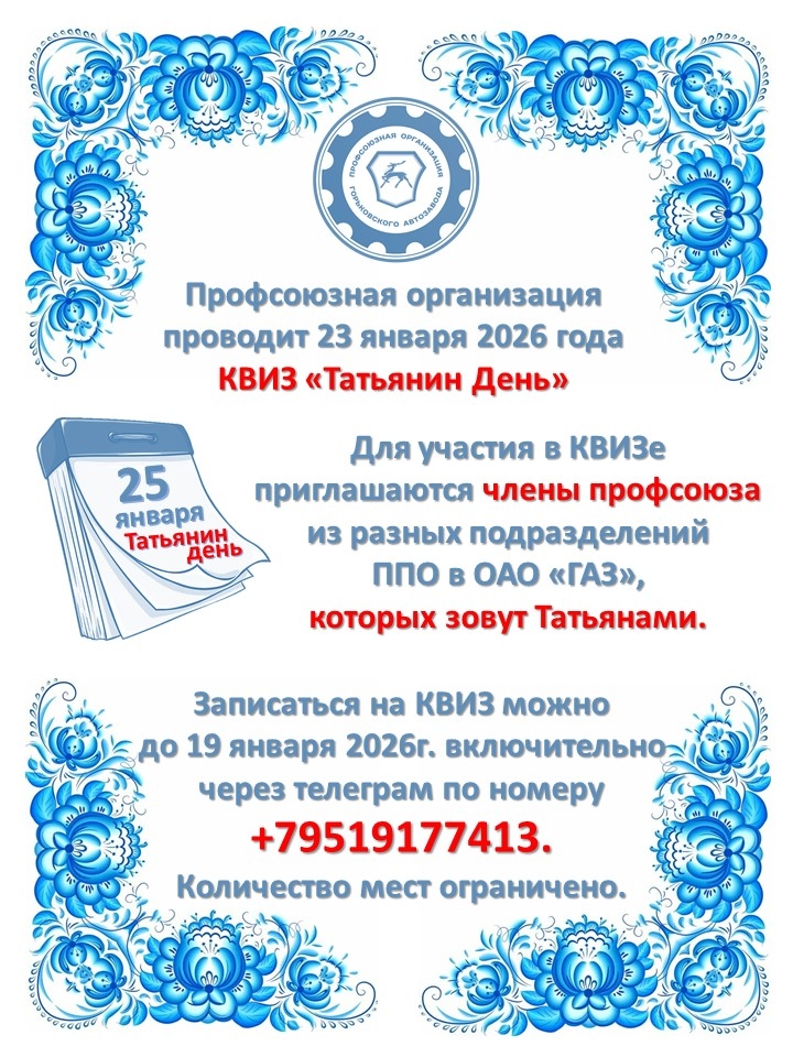 Для участия в КВИЗе приглашаются члены профсоюза из разных подразделений ППО в ОАО «ГАЗ», которых зовут Татьянами.