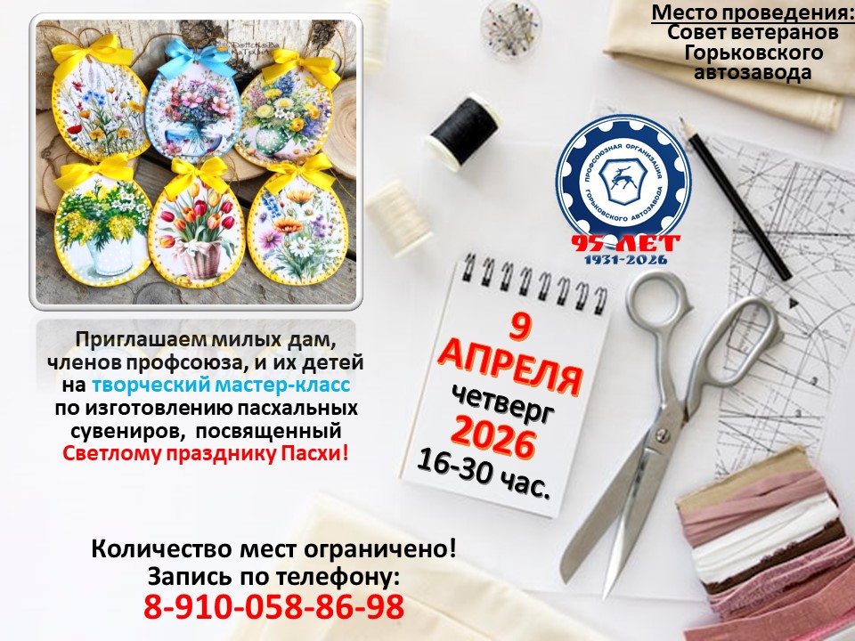 Мастер-класс пройдет в Доме ветеранов Горьковского автозавода 9 апреля 2026г. в 16-30 час.