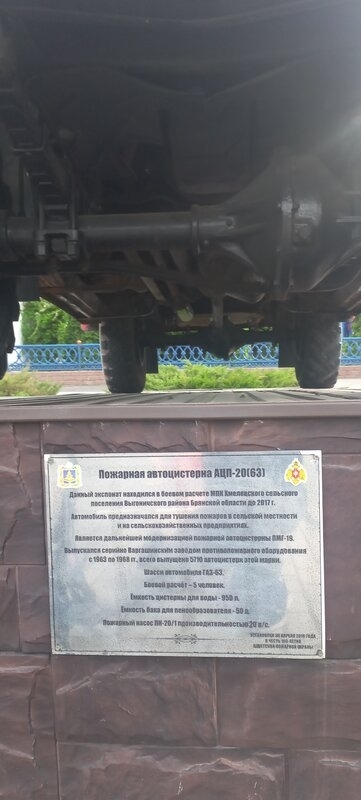 Памятная табличка гласит, что данный автомобиль использовался для тушения пожаров в сельской местности и на сельскохозяйственных предприятиях.
