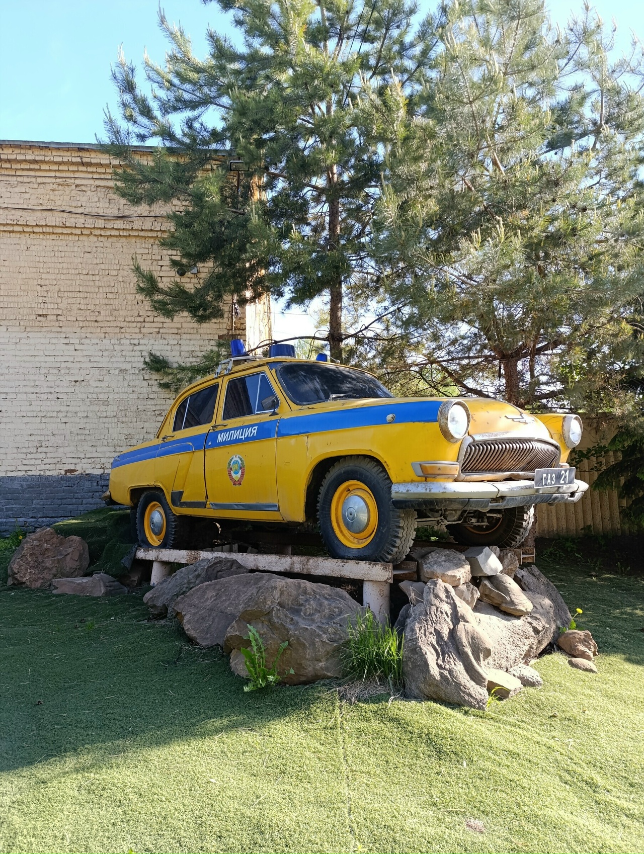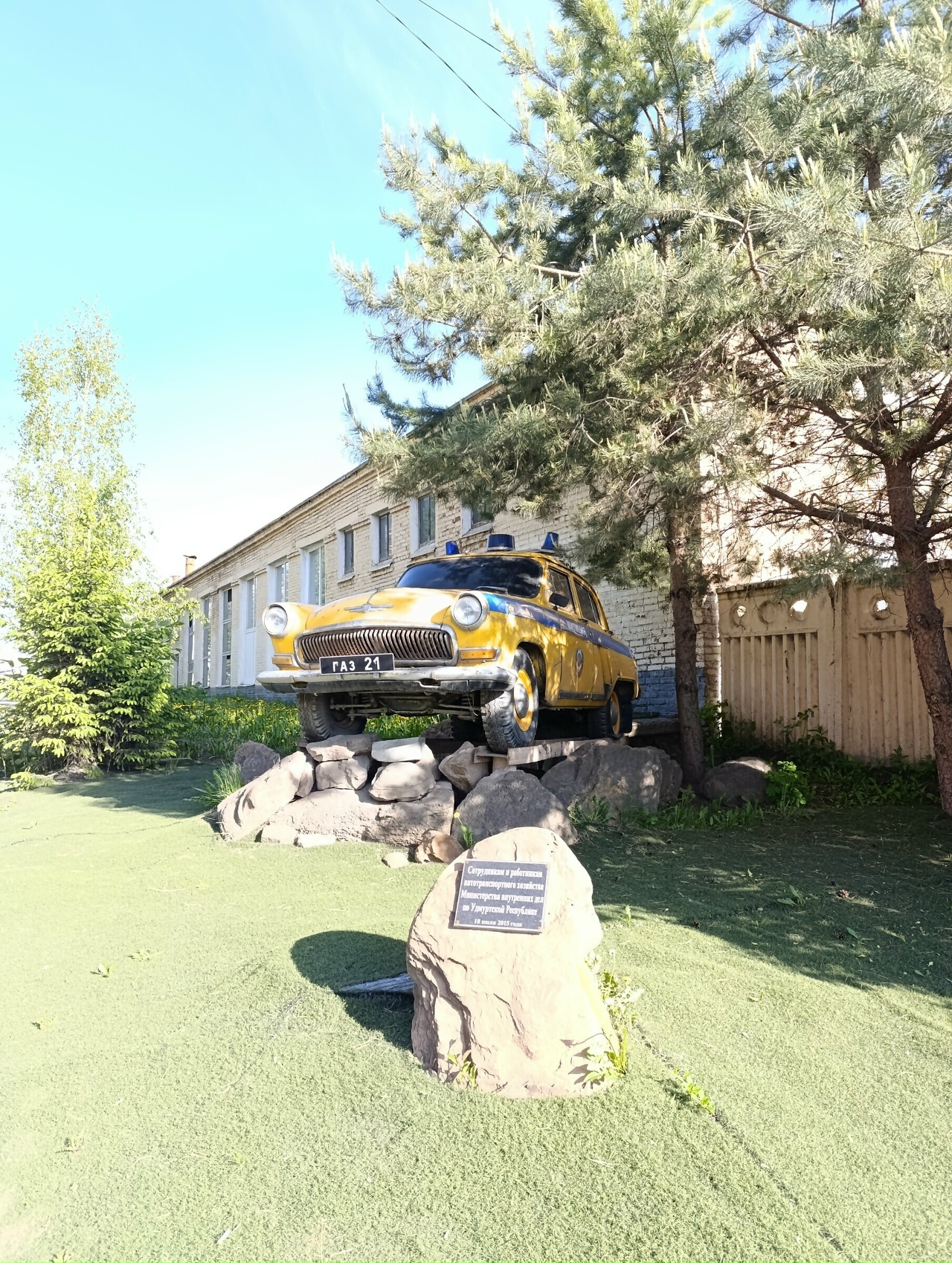 На постаменте — реальный служебный автомобиль «Волга» ГАЗ-21, который находился на службе в МВД СССР с 1959 года и прошёл полную реставрацию.