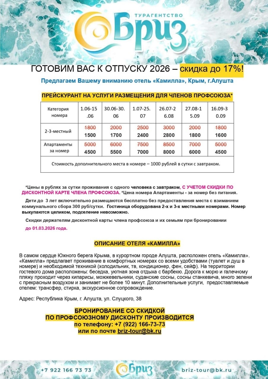 Скидки держателям дисконтной карты члена профсоюза и их семьям при бронировании до 01.03.2026 года.