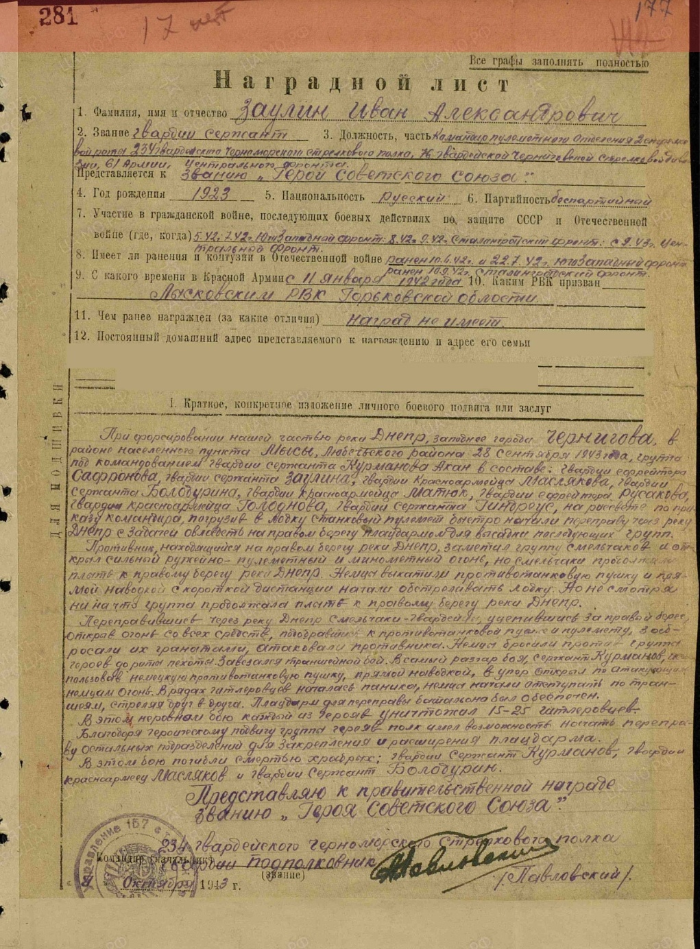 К сентябрю 1943 года гвардии сержант Иван Заулин командовал пулеметным отделением 2-й стрелковой роты 234-го гвардейского стрелкового полка 76-й гвардейской стрелковой дивизии 61-й армии Центрального фронта.