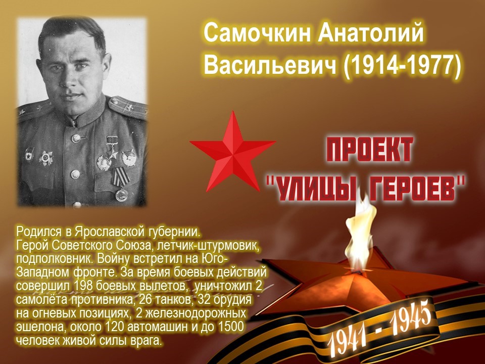 Герой Советского Союза, летчик-штурмовик, подполковник. Войну встретил на Юго-Западном фронте. За время боевых действий совершил 198 боевых вылетов, уничтожил 2 самолёта противника, 26 танков, 32 орудия на огневых позициях, 2 железнодорожных эшелона, около 120 автомашин и до 1500 человек живой силы врага.