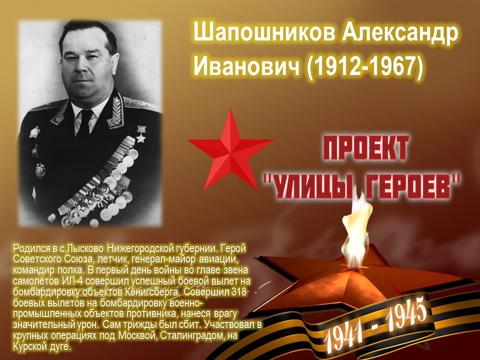 Родился в с.Лысково Нижегородской губернии. Герой Советского Союза, летчик, генерал-майор авиации, командир полка. В первый день войны во главе звена самолётов ИЛ-4 совершил успешный боевой вылет на бомбардировку объектов Кёнигсберга. Совершил 318 боевых вылетов на бомбардировку военно-промышленных объектов противника, нанеся врагу значительный урон. Сам трижды был сбит. Участвовал в крупных операциях под Москвой, Сталинградом, на Курской дуге.