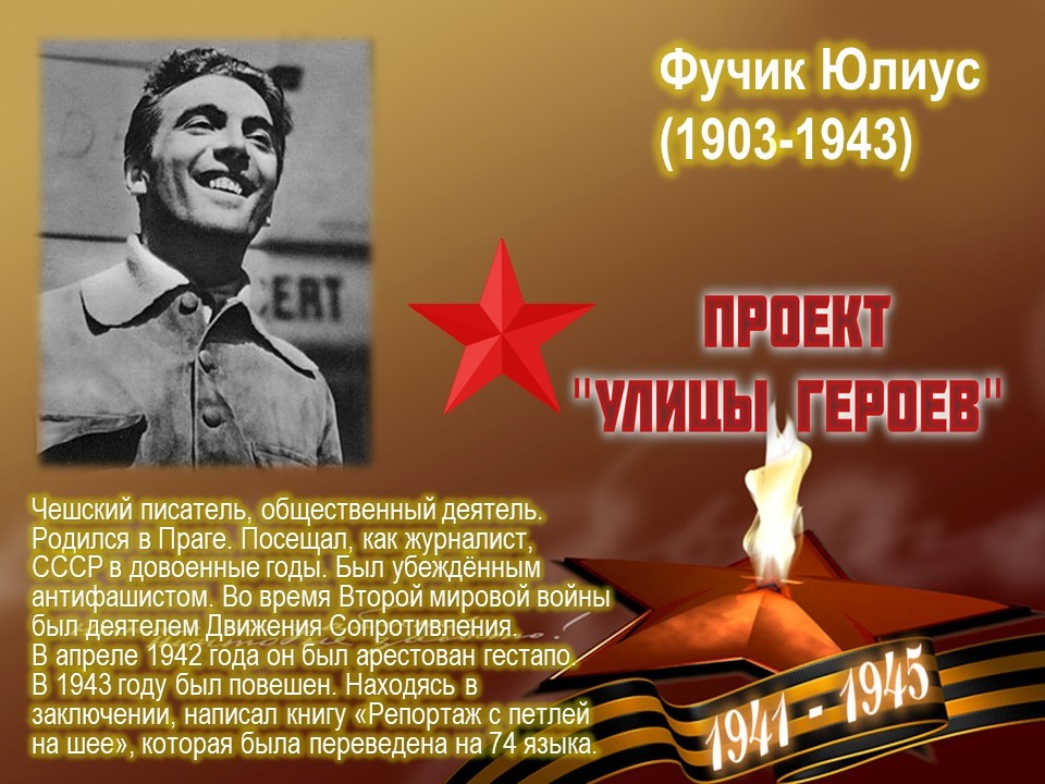 В 1943 году был повешен. Находясь в заключении, написал книгу «Репортаж с петлей на шее», которая была переведена на 74 языка.
