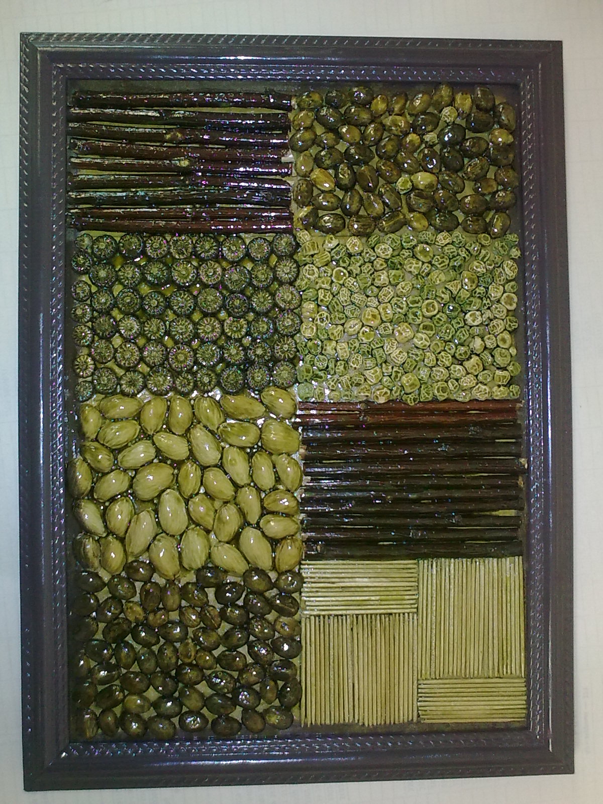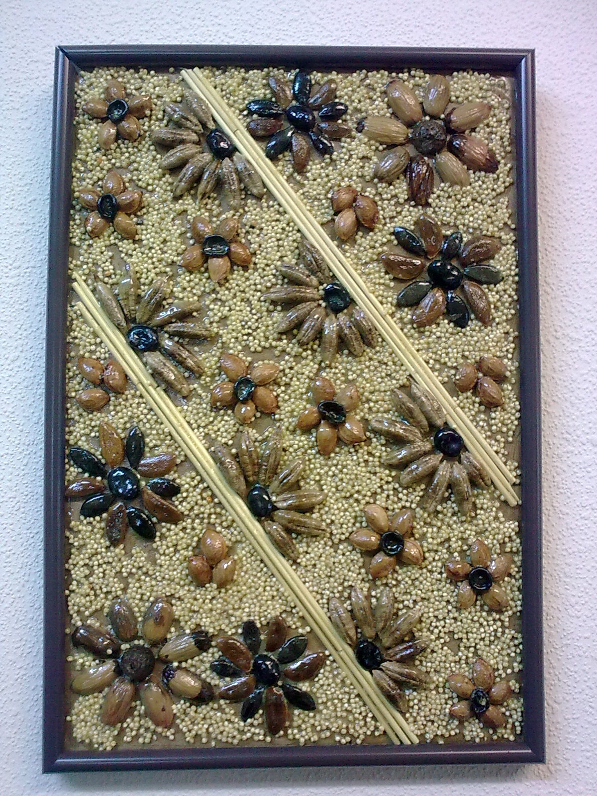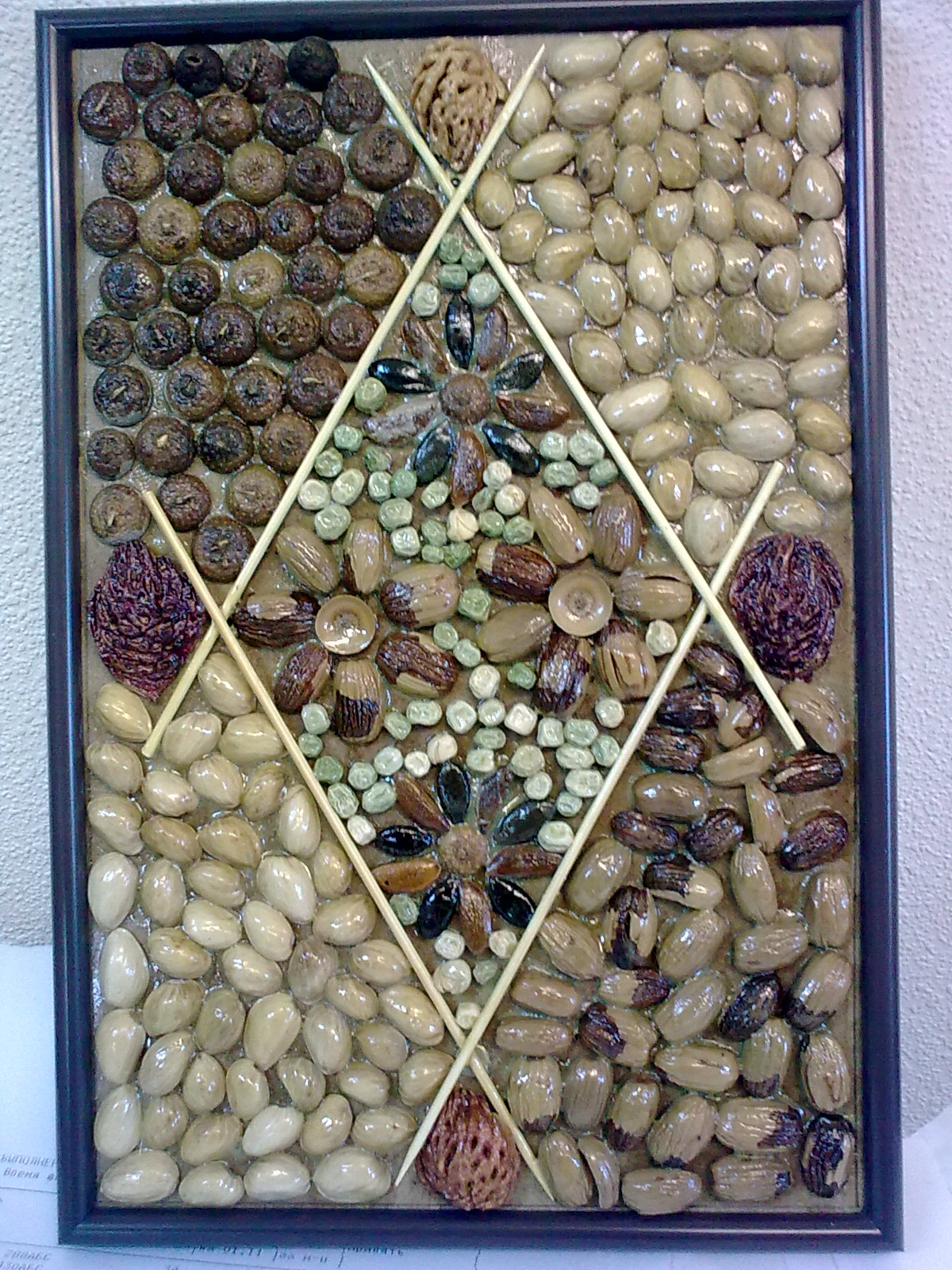 Как то, сидя дома у Ирины, нас угощали разными фруктами, осталось много всяких косточек, и мы решили как то их использовать, нам на глаза попалась невзрачная деревянная рамка, сразу же пришло в голову изобразить что то на ней, так мы стали клеить косточки от персиков, фиников. Изображать всё это в рисунках.