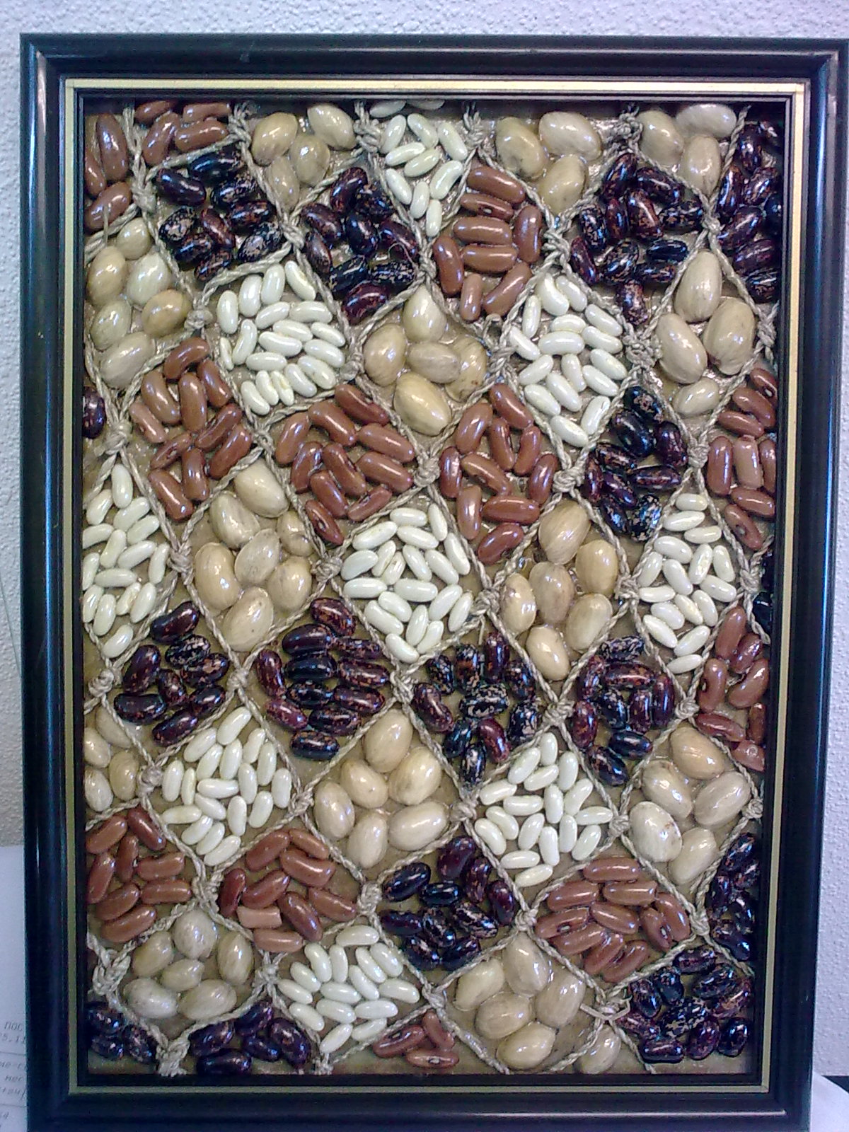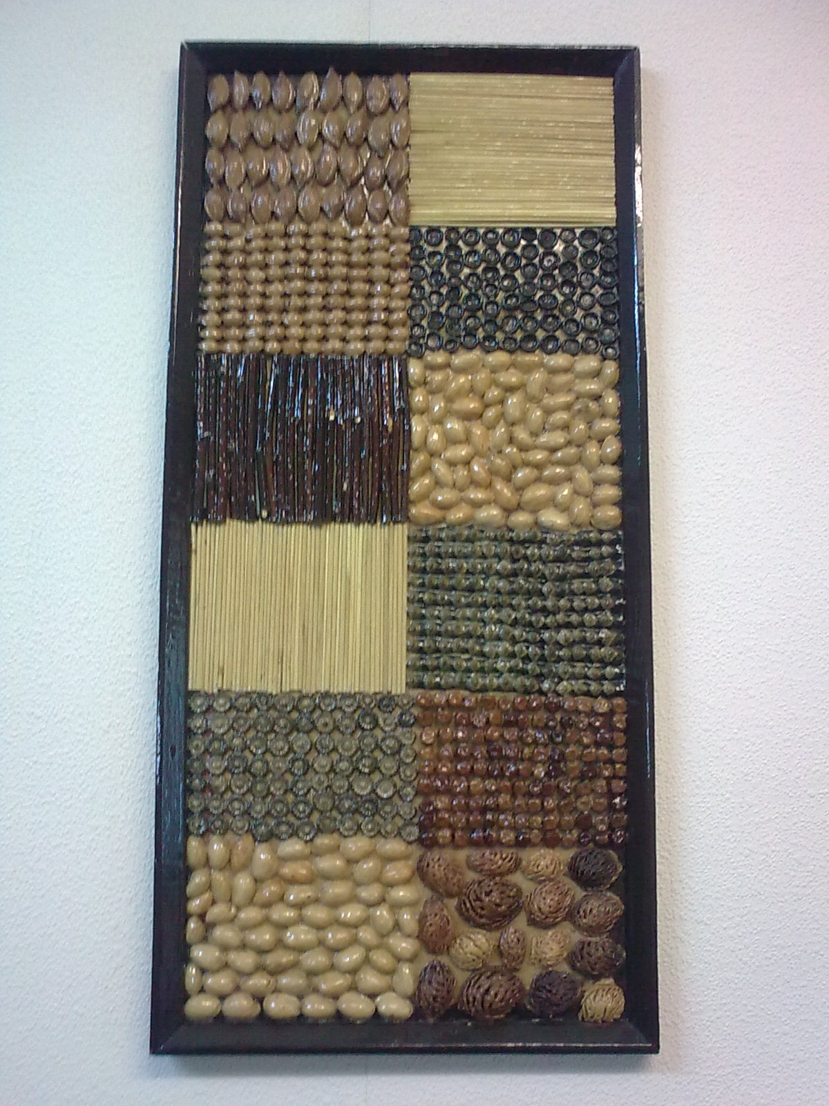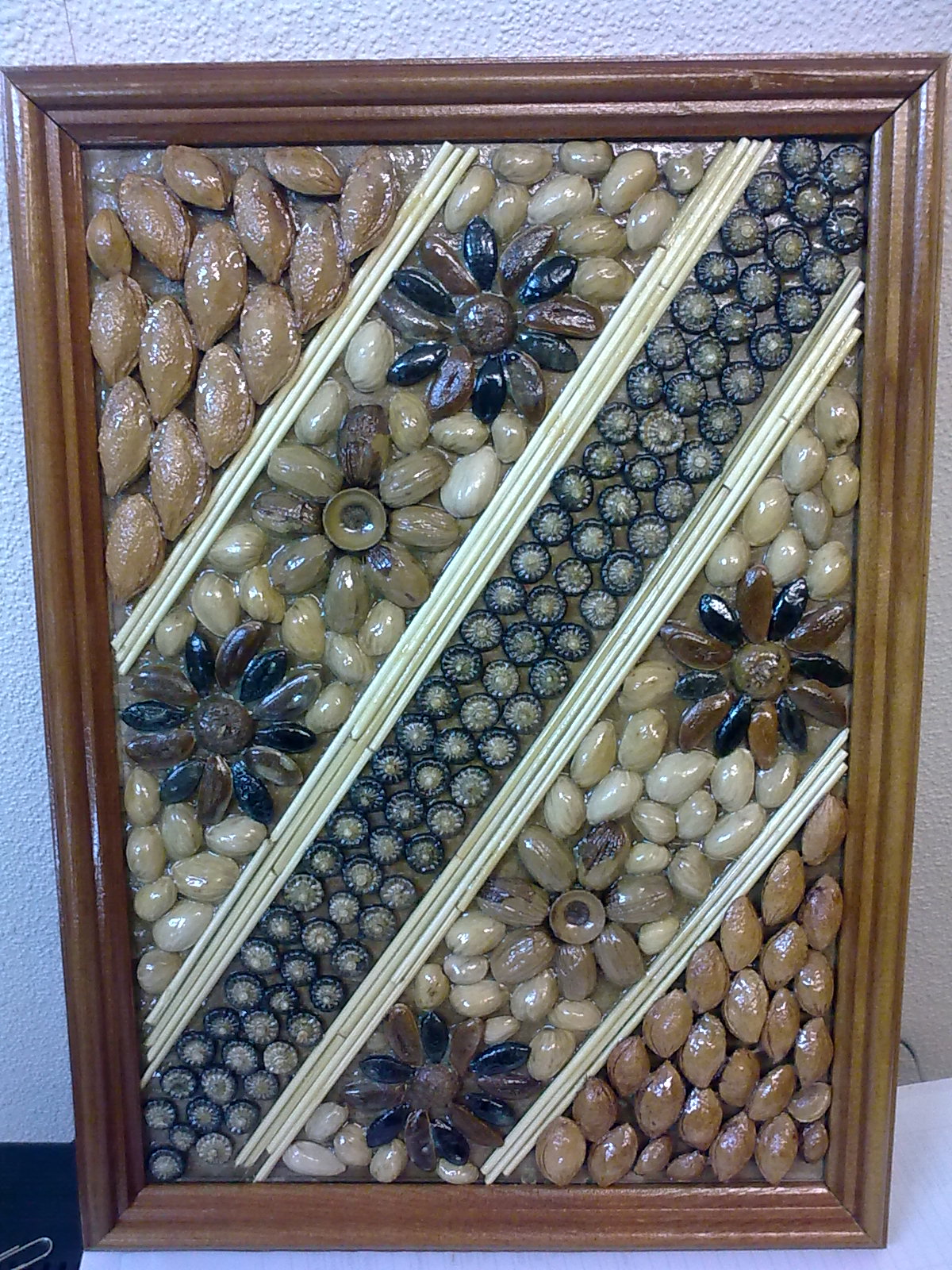 Как то, сидя дома у Ирины, нас угощали разными фруктами, осталось много всяких косточек, и мы решили как то их использовать, нам на глаза попалась невзрачная деревянная рамка, сразу же пришло в голову изобразить что то на ней, так мы стали клеить косточки от персиков, фиников. Изображать всё это в рисунках.